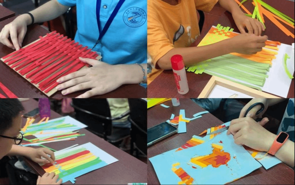随后,“小先生”周安晔带领小学员们以党史教育为主题开展创作,引导学员理解传统竹编的创作步骤及技法。小学员们在老师的指导下认真学习,一挑一压,竹条在孩子们的指尖交相缠绕,散乱的篾片经过小学员们巧手的编织渐渐有了形状:中国地图、嘉兴红船、中国少年先锋队队徽……“小先生”带领大家巧妙地运用竹编技巧,创作出红军长征、抗日战争等重要历史事件的场景。