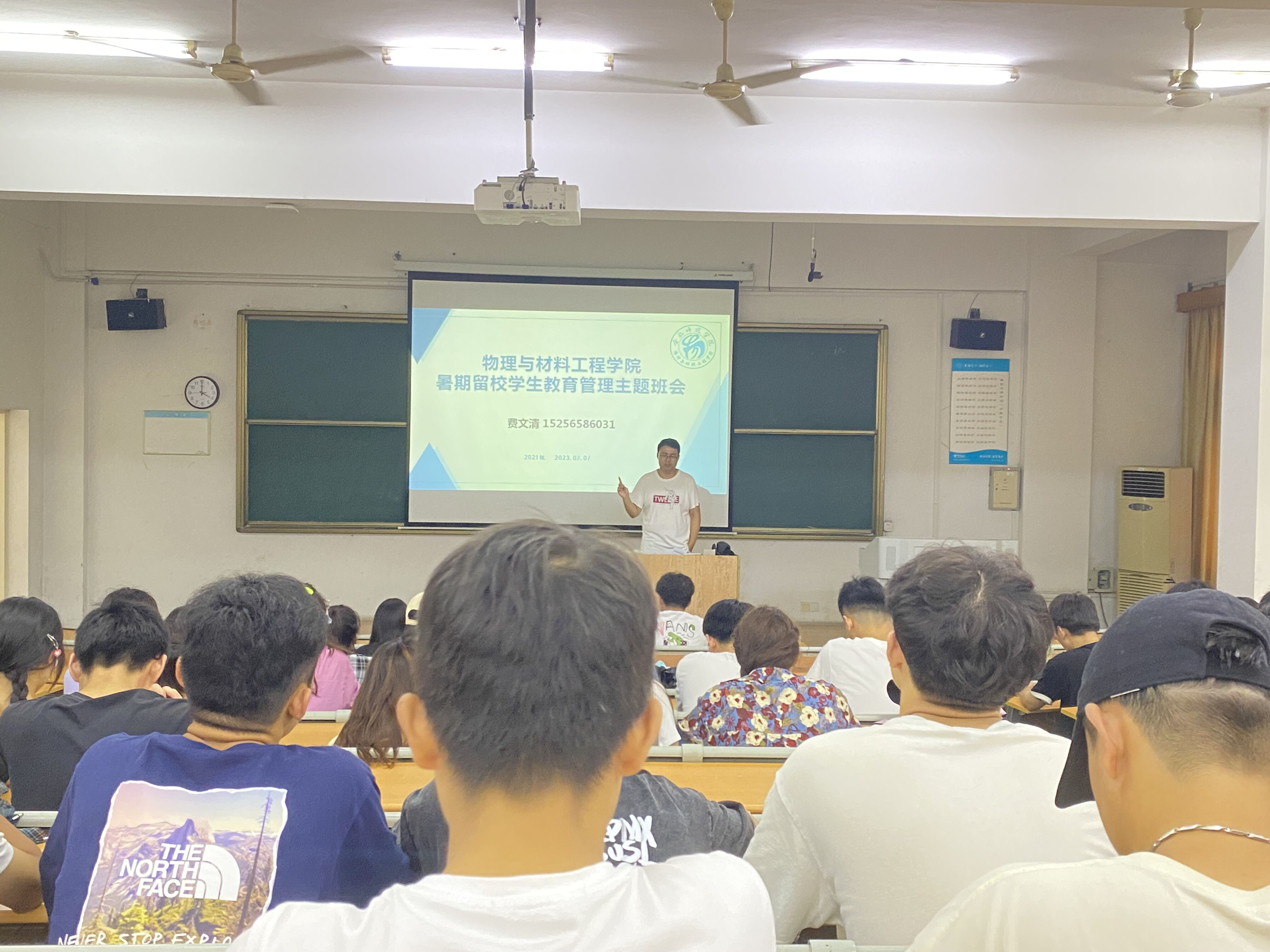 本网讯 为做好学院2023年暑期留校学生安全教育和管理工作,营造和谐稳定的校园环境。物理与材料工程学院于7月7日下午在博约楼101、博约楼112召开暑期留校学生教育管理主题班会。班会由各年级辅导员主持,2020级、2021级和2022级全体留校学生参会。
