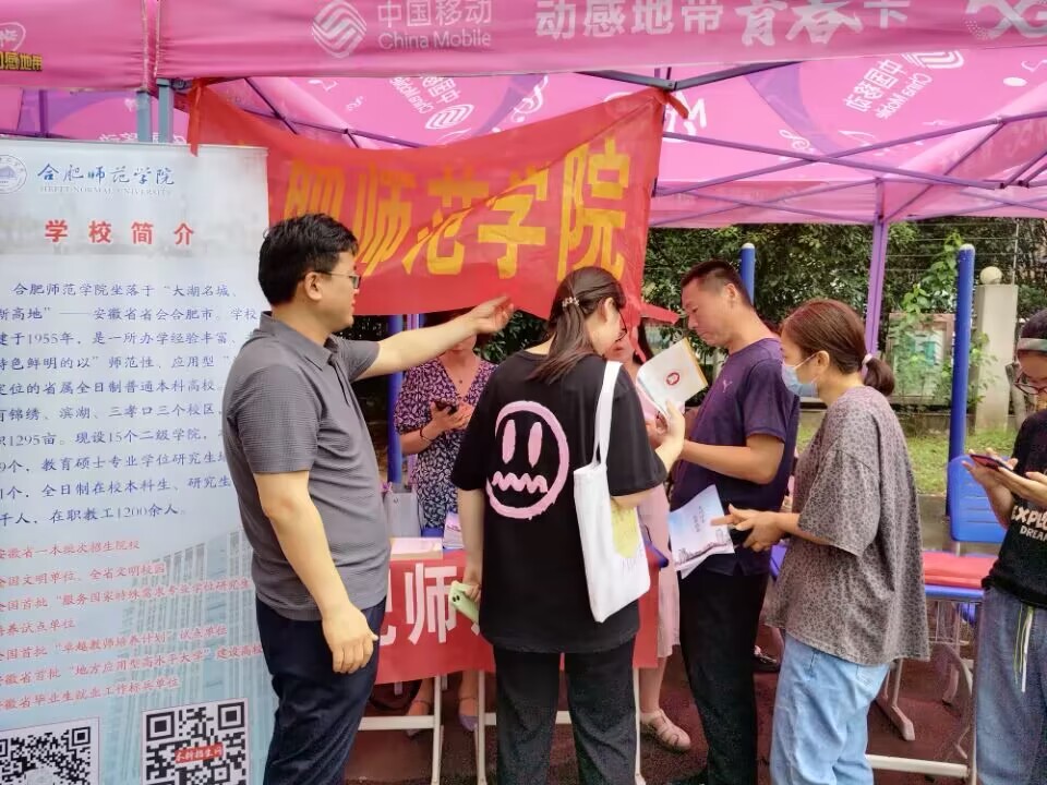 本网讯 为吸引更多优秀考生报考我院,进一步提升学院生源质量,6月24日下午,在高考分数公布的第一时间,马克思主义学院在院长何光辉的带领以及周继祥、王潇、孙梦琳等老师和9名学生的参与下,组成招生宣传团队,分别前往合肥九中四牌楼校区与合肥八中教育集团肥西中学进行招生宣传。