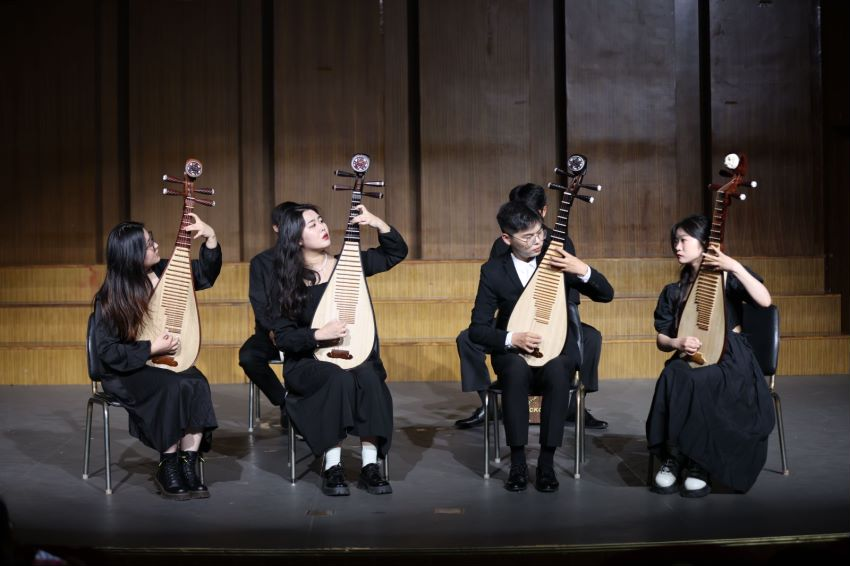 伴随着清脆悠扬的民乐之声,音乐学院民乐专业的学生带来的民乐合奏《小满大暑》,拉开了音乐会的序幕;女声独唱《我怎样去爱你》作品旋律优美,深情大气,歌词情深意切,抒发了海外游子对祖国浓厚的爱意;室内乐《一步之遥》饱含着现代音乐的动感也拥有古典音乐的魅力;女声二重唱《待到微风轻轻吹过》选自歌剧《费加罗的婚礼》,演员激情澎湃的演唱将剧中诙谐、幽默、既轻松又多重情节交叉的特点得到了淋漓尽致的体现;二胡合奏《赛马》通过展现奔腾激越纵横驰骋的骏马,来刻画蒙古族人民节日赛马的热烈场面;竹笛重奏《走进快活岭》运用中国传统音乐锣鼓点的节奏型,大跳音程的演奏,将登山者轻快的心情通过短促的吐音鲜明的表现出来;歌剧《江姐》选段《红梅赞·绣红旗》表达了我们的中华儿女,热爱党以及热爱祖国的一片红心;琵琶四重奏《自由探戈》以其独树一帜的快节奏风格吸引着台下观众的心弦;舞蹈《竹林晨语》亦动人的音乐,优美的舞姿,展现出青春的魅力;古筝重奏《柳京之舞》模拟了朝鲜民族风格音调,展示出新颖多变地听觉感受;钢琴独奏《火把节之夜》通过各种旋律的对比,运用民族特色的节奏,生动形象地再现了彝族欢快、热烈的土风场景;男女二重唱《让我们携手同行》选自歌剧《唐璜》,生动展现了各自不同的人物特征和内心变化;古筝协奏曲《定风波》借古乐抒发今日的情怀,表达了中华民族面对挫折不屈不饶的精神;男女四重唱《饮酒歌》选自威尔第歌剧《茶花女》以轻快的舞曲节奏、明亮的大高色彩及六度大跳的旋律动机描绘出沙龙舞会上热闹、欢乐的情景;八手联弹《费加罗的婚礼》通过双钢琴多声部的演奏将作品内涵尽数展现;小合唱《共筑中国梦》演唱者深入情境展示了中国人民满怀豪情,为实现中国梦努力向前的精神面貌,将音乐会推向了高潮;最后,在音乐学院2023届毕业生演唱的歌曲《星辰大海》、《告别是一件难事》中,整场音乐会华美落幕。