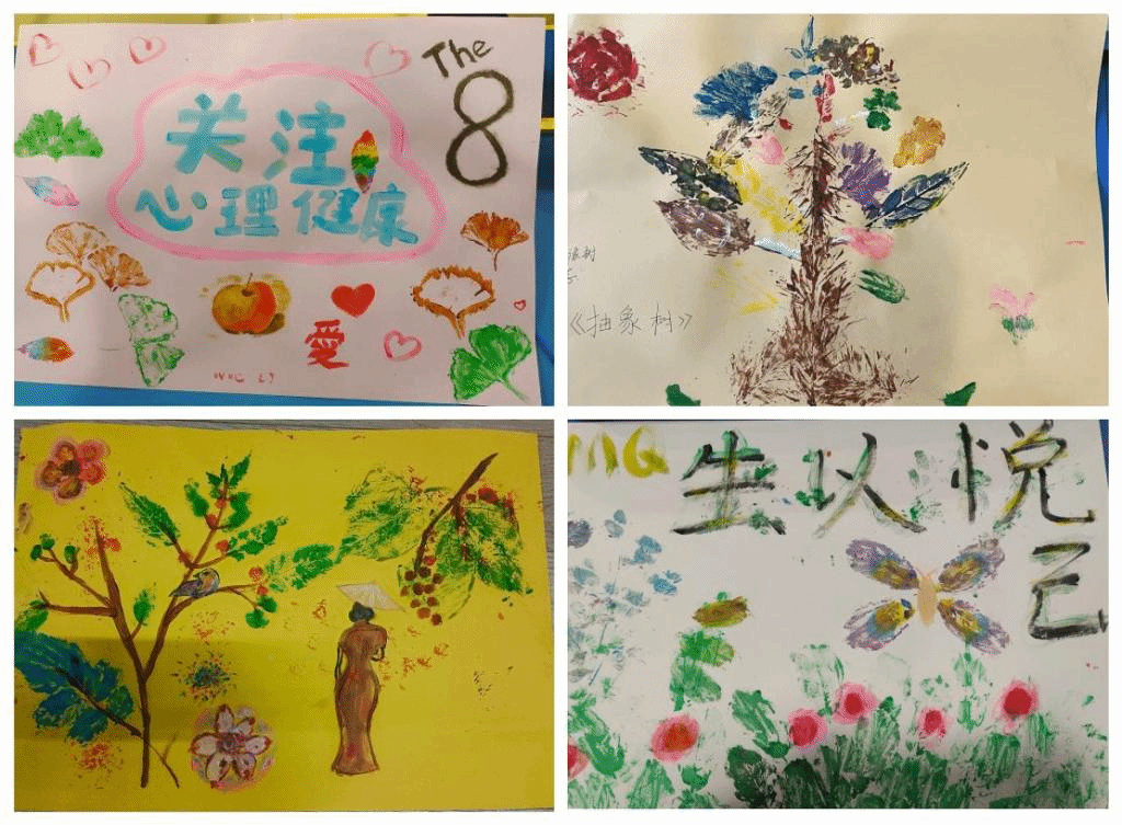 活动中,同学们充分发挥自身想象力,不仅局限于树叶本身的形状,还利用工具裁取出花瓣、三角形和心形等各式各样的形状进行印染。同学们纷纷以自己的心理近况与未来畅想为灵感,创造出一幅幅具有艺术气息的印染彩图。