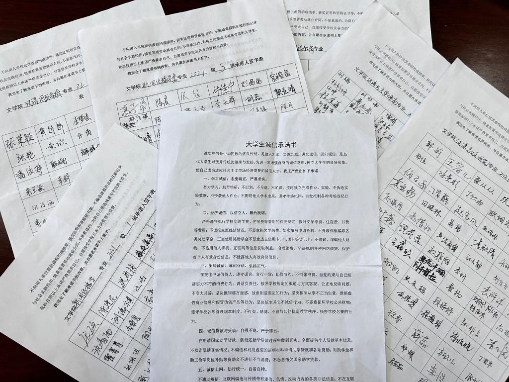 文学院积极开展签订诚信承诺书主题活动,承诺书从学习诚信、经济诚信、生活诚信、诚信贷款与受助、诚信上网、诚信就业六个方面,倡导学生自觉做到诚实守信,把道德原则和道德规范内化为内心信念,外化为实际行动,从而培养大学生诚信道德意识。