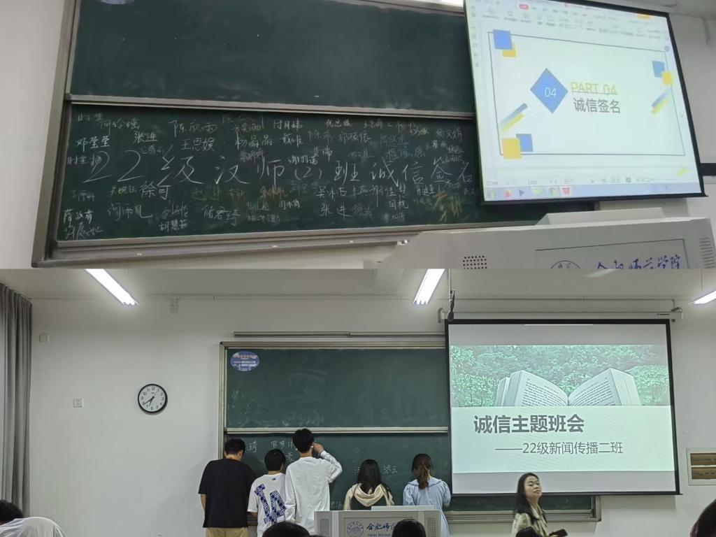 诚信,乃为人之本,人无信则不立。诚信是中华民族传统文化的精髓之一,也是社会大力倡导的道德风尚。为提高大学生诚信意识,文学院组织各班级开展诚信签名活动。同学们纷纷在黑板上签名,表明自己履行承诺的决心。活动过程中,班级委员积极宣传个人诚信的重要意义,在广大同学中间营造出了“人人知诚信,人人讲诚信”的良好教育氛围。