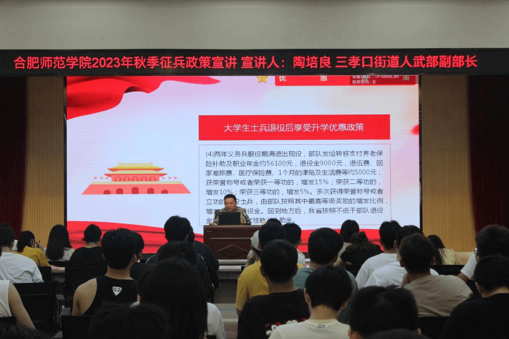 5月30日下午,学院2023年征兵政策宣讲会在锦绣校区大学生活动中心举行。三孝口街道人武部副部长陶培良作为特邀专家入校开展征兵宣讲,全体毕业班辅导员、20级辅导员及意愿入伍的部分毕业生参加了征兵政策宣讲会。本次征兵宣讲会既是面向全体在校学生的一次国防教育课,又普及了大学生参军入伍的基本要求、优待政策,让同学们更好地了解部队、向往部队。陶培良详细介绍了征兵政策、参军流程、入伍提干、军营生活、退役优待政策等,讲述了投身火热军营,献身国防事业的重要性。宣讲结束后,参会师生进行了互动,陶培良针对在场学生提出的问题进行了专业及耐心的解答。