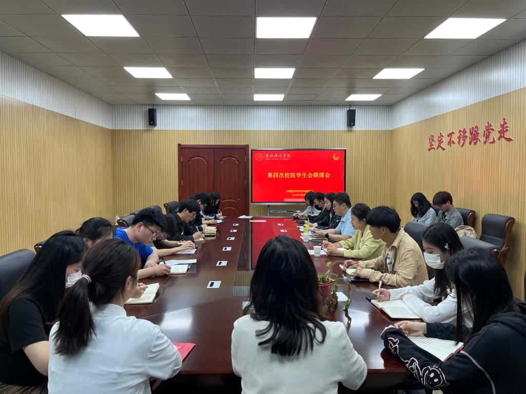 本网讯 5月26日中午,2023年第四次校院学生会联席会议在锦绣校区共青之家会议室召开,院团委书记刁文彬,院学生会秘书长魏晓倩,院学生会主席团成员和各二级学院学生会春季执行主席参加本次会议。