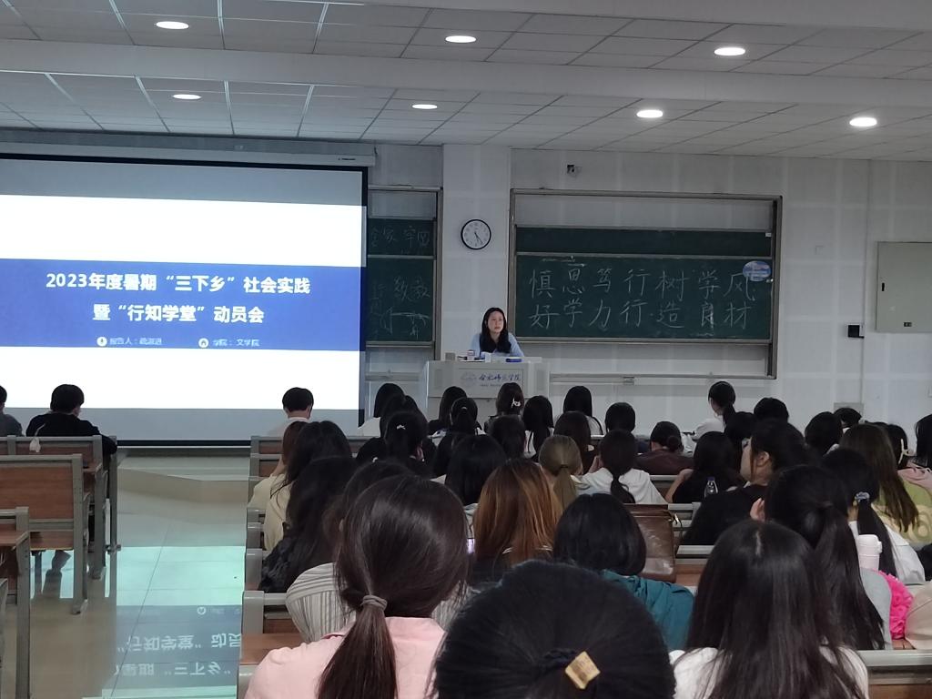 本网讯 2023年5月22日,文学院在滨湖校区博学楼A108召开2023年度暑期“三下乡”社会实践暨“行知学堂”动员会,文学院2021级、2022级学生参加动员会。会议由文学院团委副书记疏淑进主持。