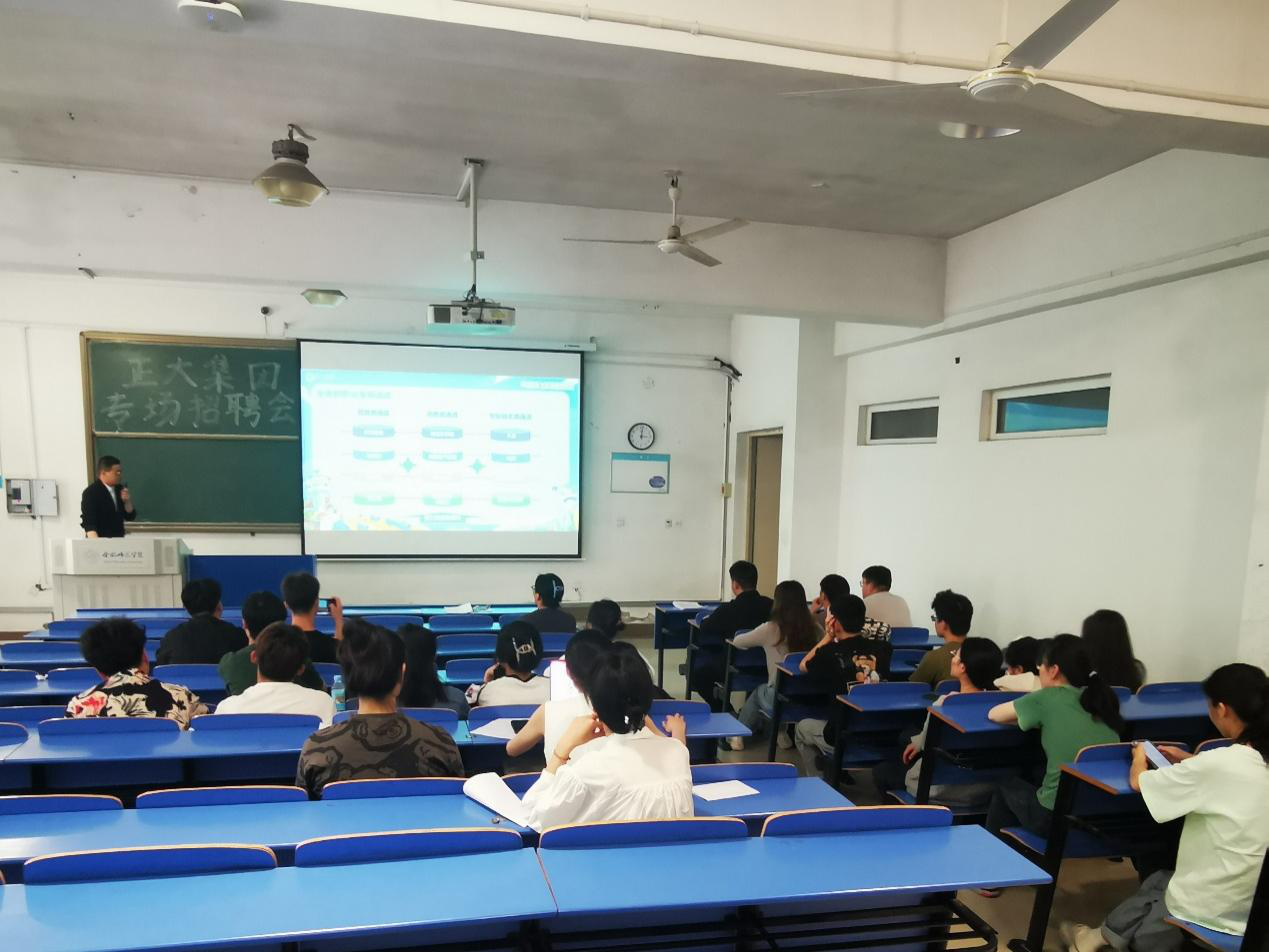 正大集团人事经理赵邓雅和主管瞿华、合肥区域经理孙绘东和主管杨侃一行4人来校招聘宣讲,瞿华和杨侃分别结合PPT和公司宣传视频,从正大集团的发展历程、未来发展和公司特色进行了介绍,重点介绍了单位基本情况和相关产品,指出集团愿景是“做世界的厨房,人类能源的供应者”。就本次招聘所需人才、岗位需求以及工资待遇等情况向同学们作了详细的介绍,并耐心细致回答了同学们共同关心的企业发展与个人成长等方面的问题。
