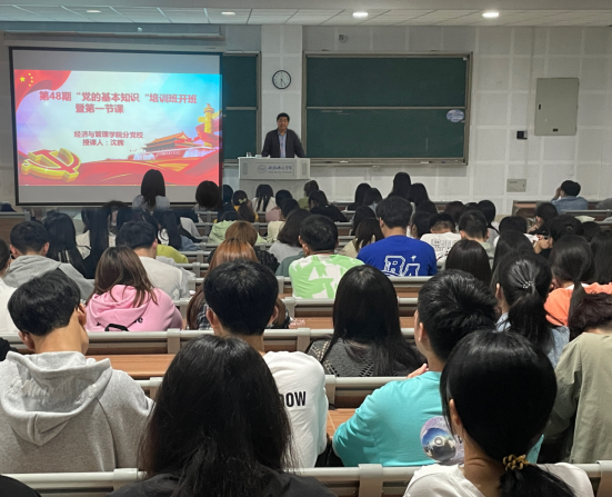 本网讯 4月27日,经济与管理学院党校第48期“党的基本知识”培训班开班。今年,学院分党校共有参训学员236人,其中锦绣校区25人,滨湖校区211人。学院党委书记、党校校长沈辉首先向参加本次培训班的入党积极分子和发展对象表示热烈的祝贺,并阐述了本次培训的必要性与重要性。