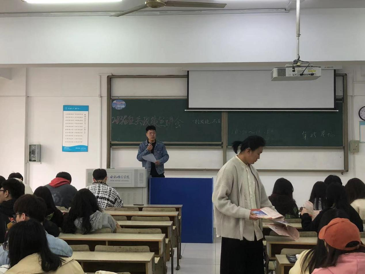 会上,毕业班辅导员王岩对2023年征兵政策进行了详细解读,重点强调了大学生应征入伍的重大意义,以及大学生入伍后可享有的优先考学提拔、补偿学费,退役后享受就学就业优惠等优扶政策。音乐学院党委副书记蔡成梅指出,高校大学生入伍是党中央、国务院、中央军委作出的重大战略决策,是新形势下加快军队国防现代化建设,实现强国梦、强军梦,维护国家总体安全的重要举措,也是高校落实立德树人根本任务和为党育人、为国育才使命的必然要求。希望同学们将征兵入伍作为一个提升自我的桥梁,将个人理想与富国强军相结合,把个人成长融入强国梦、强军梦的伟大实践中,将个人青春风采融入祖国发展,积极响应国家征兵入伍的号召,投身国防建设的伟大事业。