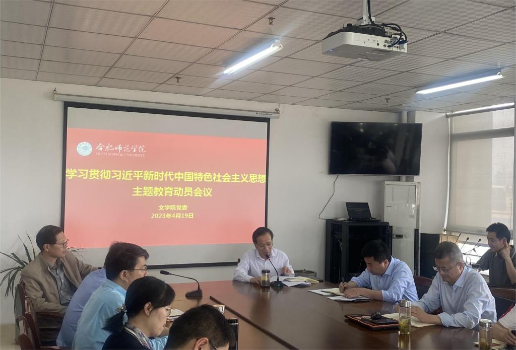 本网讯 4月19日下午,文学院党委在会议室召开学习贯彻习近平新时代中国特色社会主义思想主题教育动员会议。文学院党政班子成员、全体教师党员参会,党委书记李旺生主持会议并做动员讲话。