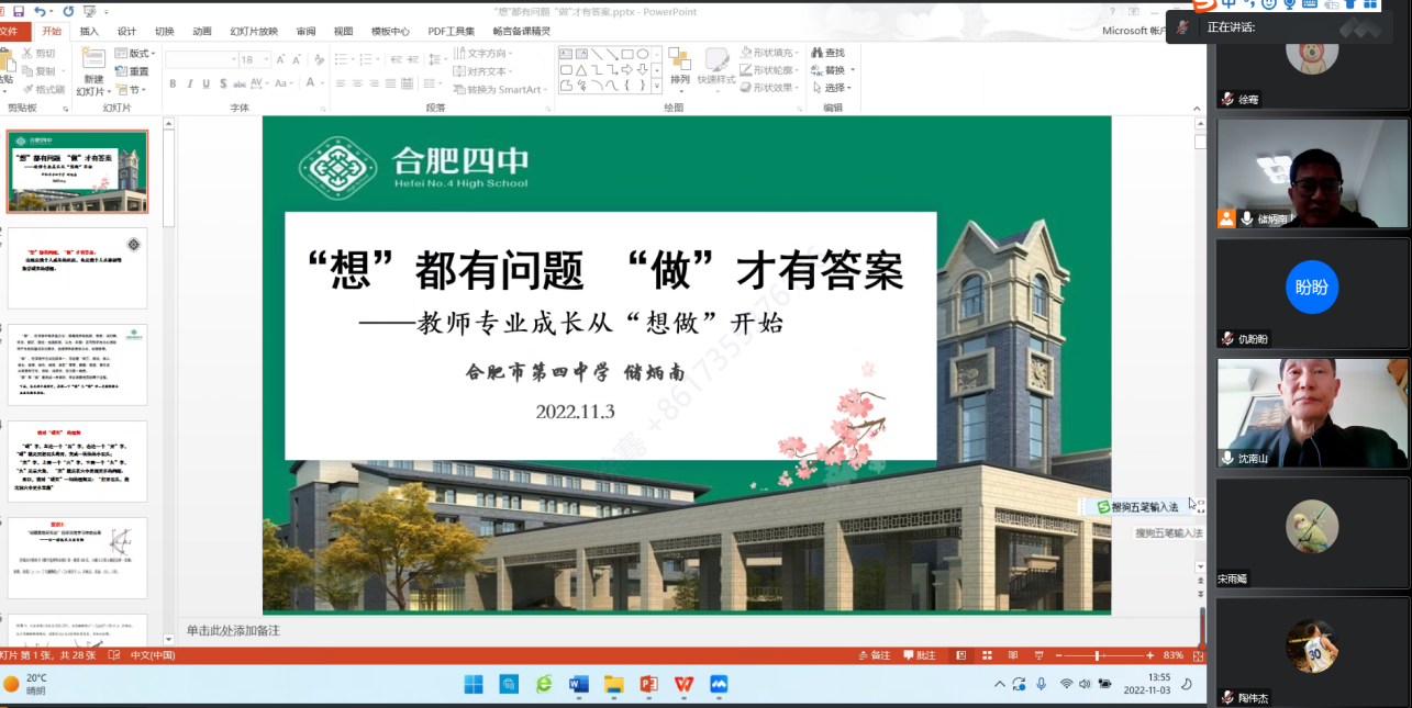 本网讯 11月3日下午,合肥四中正高级教师储炳南线上为我院全体研究生作了题为“‘想’都有问题,‘做’才有答案”的专题学术报告。报告由数学与统计学院沈南山教授主持,数学与统计学院全体研究生听取了报告。