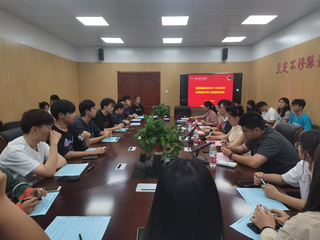 本网讯 近日,院团委在锦绣校区共青之家召开了2021—2022学年院学生会工作人员述职评议会,校团委全体成员、学生工作部有关人员、各二级学院15名普通学生代表参与考核。