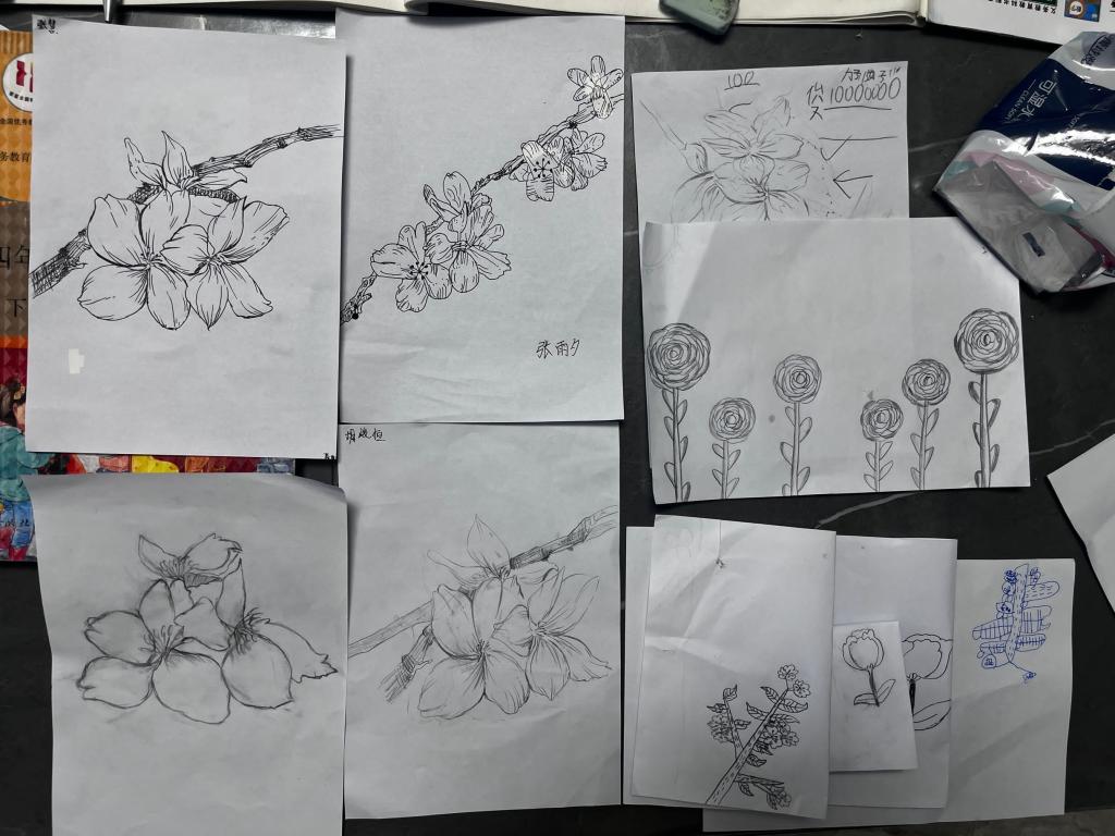 课程开始,小先生利用多媒体课件展示盆栽花卉,采用谈话法让小学员们谈谈对花卉的认识和理解,小学员们认真欣赏,并积极回答了有关花卉种类的提问。随后小先生引导学员欣赏与花相关的若干美术作品,让他们理解同一题材有多种绘画表现形式。线造型是绘画最基本的表现形式,小先生引导学员观察盆栽花卉,分析花瓣叶子的形状和组合规律、枝干的穿插规律,采用演示法让学生掌握线描写生的方法及要领。小先生特别强调观察的整体性和用线的流畅性,在写生过程中让小学员精准把握写生对象的特征,有目的地进行取舍。