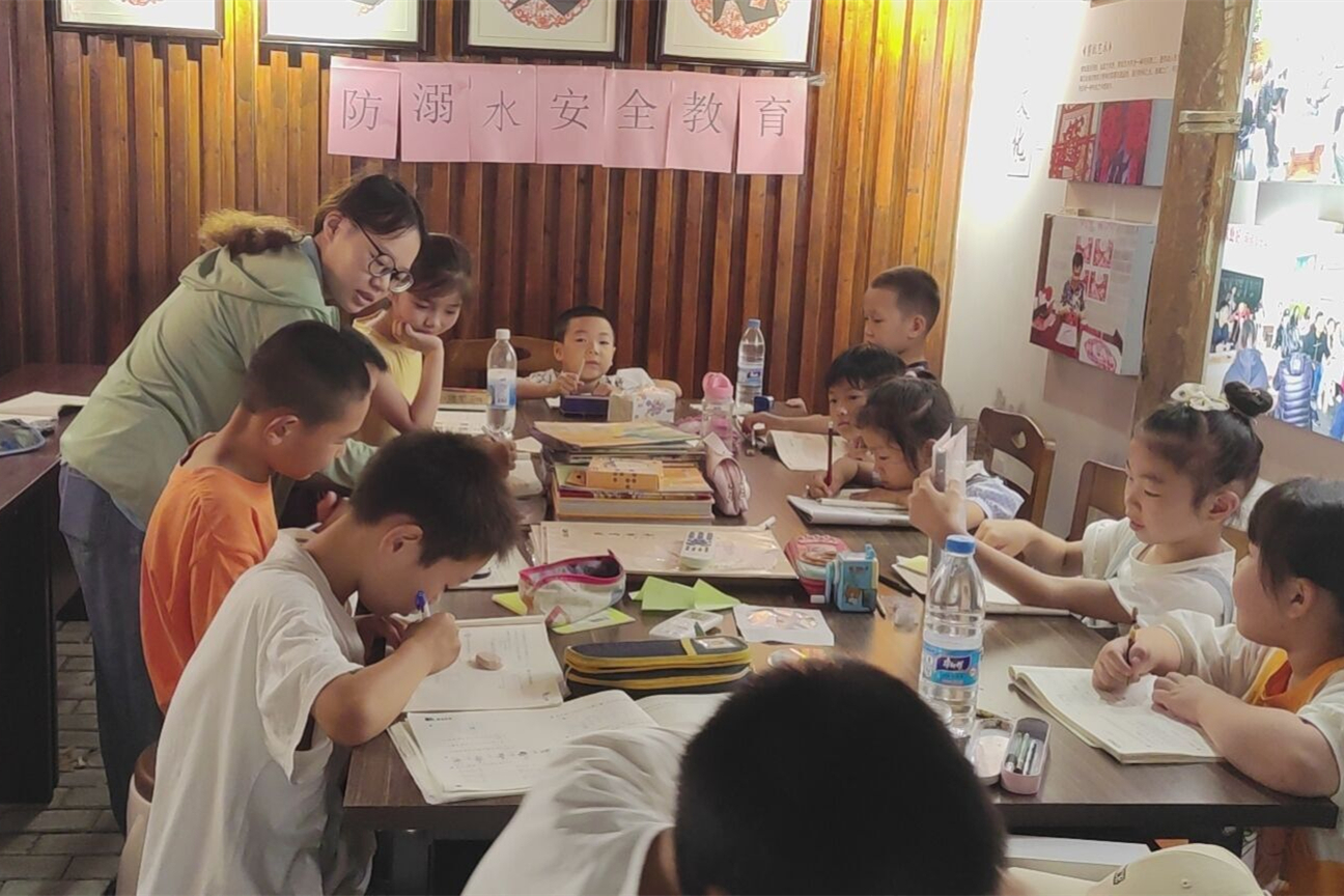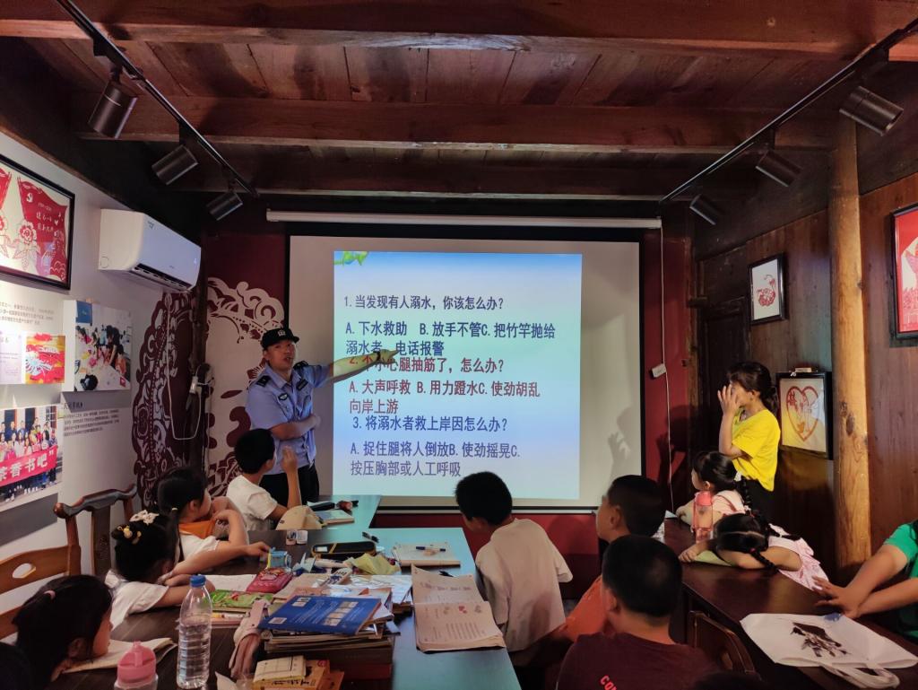 本网讯 7月14日上午,庙首镇派出所副所长王文萍、民警李国,里仁村村委李玉霞,里仁儿童服务站站长李慧等人走进里仁儿童服务站,同院团委旌德行知学堂“小先生”们一同完成防溺水安全教育课程教学。
