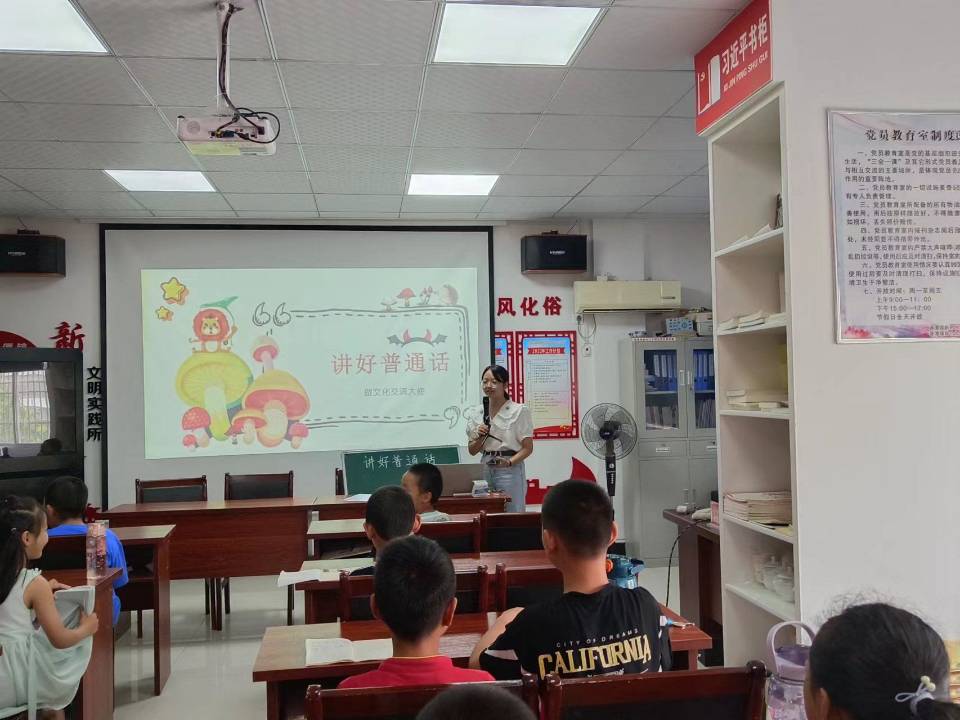 本网讯 7月8日,在潜山市源潭镇行知学堂开展了“讲好普通话”特色课程,拓展了文学院发挥专业优势在乡镇推广普通话实践活动。
