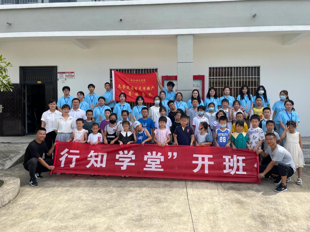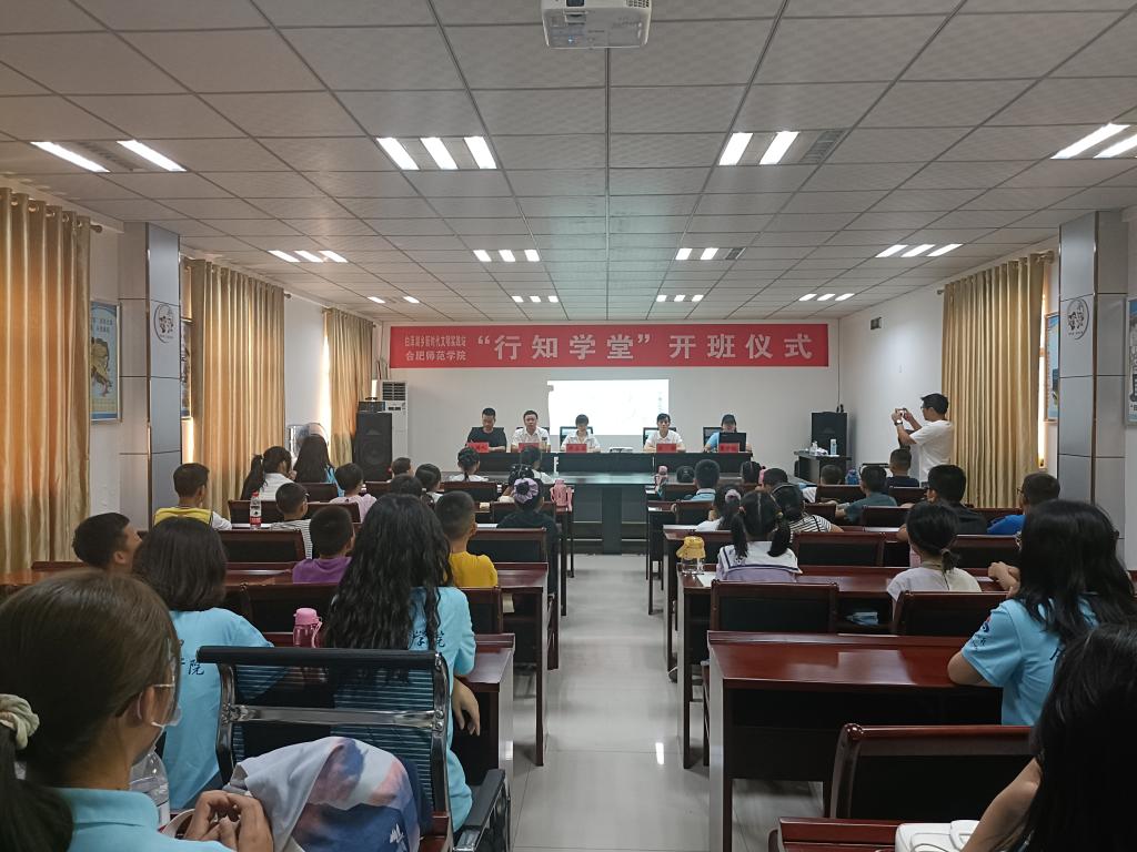 本网讯 7月11日,文学院稷下学宫行知学堂开班仪式于安徽省安庆市白泽湖乡顺利举行。出席此次开班仪式的有团宜秀区委副书记乔晶晶、白泽湖乡宣传委员、统战委员方芳、白泽湖乡人大副主席袁亮,主持人李伟,全体小先生以及39名小学员。