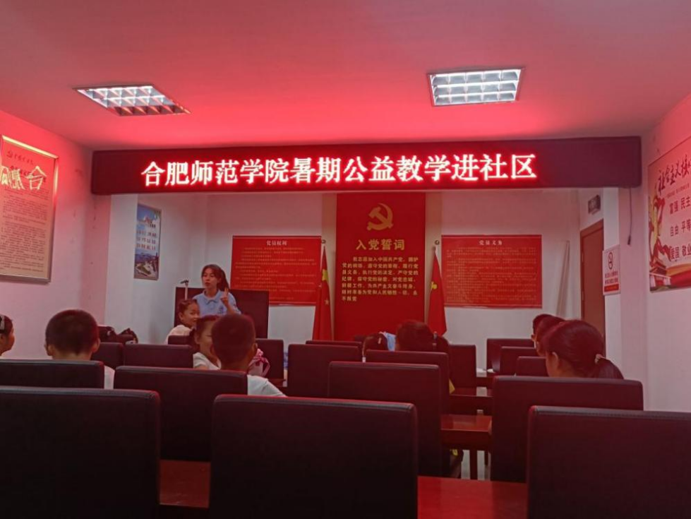本网讯 7月5日,铜陵市义安区惠泉社区“铜都行”行知学堂顺利开班,来自艺术传媒学院、马克思主义学院、物理与材料工程学院、经济与管理学院和化学与化学工程学院的10名“小先生”和20名小学员共同参加了此次开班仪式。