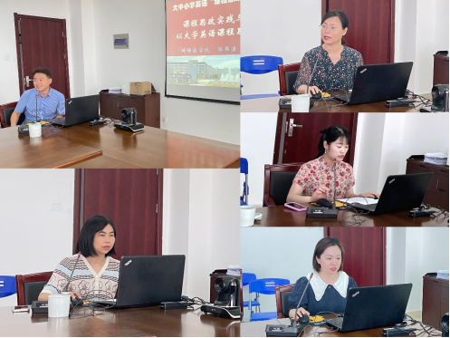 安徽省课程思政教学名师、蚌埠医学院外文教研室主任郭书法教授从学术团队、双基建设和育人成效等方面介绍了大学英语课程思政的探索与实践,强调应集百家之长,打造温度课程,营造温情课堂,培养温润学子;王勤梅副教授讲述如何将思政平台与教学实践相结合,构建PURE大中小学一体化英语课程思政研究体系;陈英副教授从以赛促学和以赛促教方面展示如何在培养英语师范生的过程中落实立德树人总要求,提出心中有学生,眼中有教材,脑中有课标;黄菁菁老师介绍了基于项目式教学法的中国精神教学案例,将课程思政有机融入各个教学环节,培养学生的家国情怀和文化自信;王燕老师介绍了基于项目式教学法的环境保护教学案例,着重启发学生的发散性思维,培养其思辨能力;亳州市初中英语名师工作室主持人、利辛中学杨保坤老师分享了名师工作室与初中英语课程思政建设经验,提出应将价值塑造、知识传授和能力培养融为一体,有效推进英语课程思政;合肥市45中芙蓉分校南校区英语名师工作室主持人盛峰云老师提出初中英语教学应依托教材,深挖育人元素,依托教育科研课题,提升课程思政建设。几位老师的分享引起了参会者的浓厚兴趣。