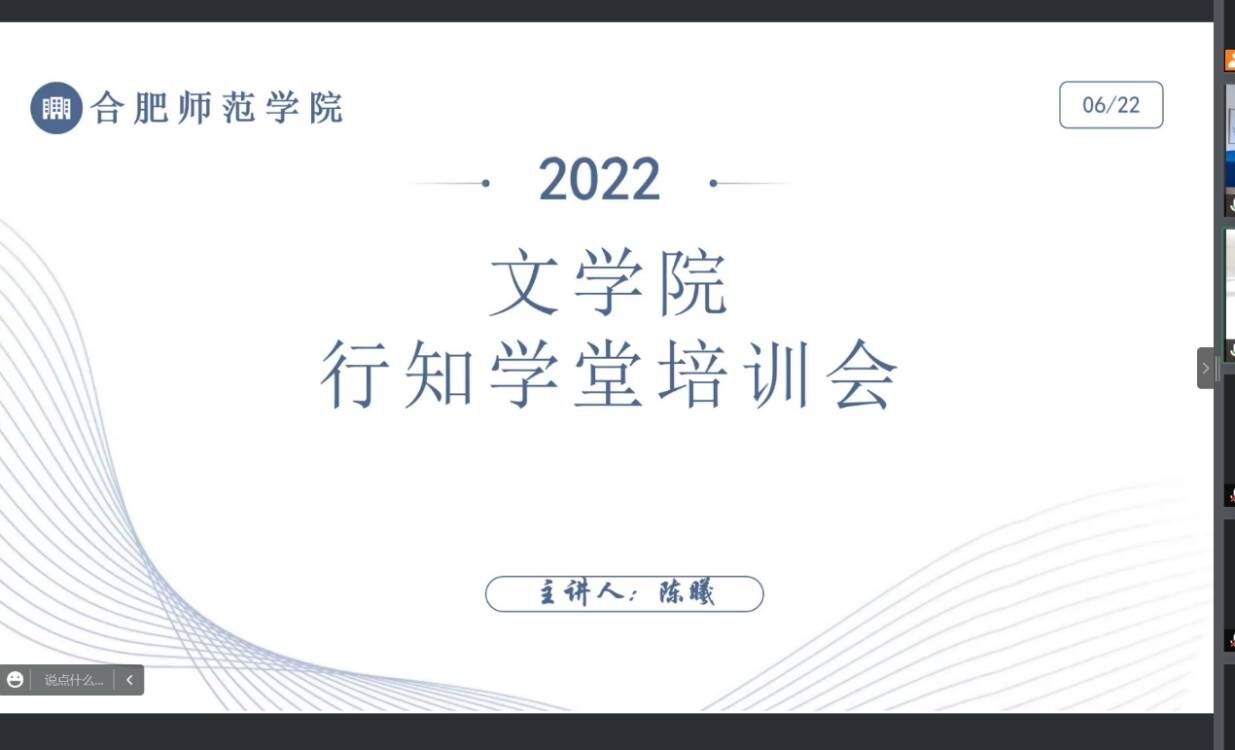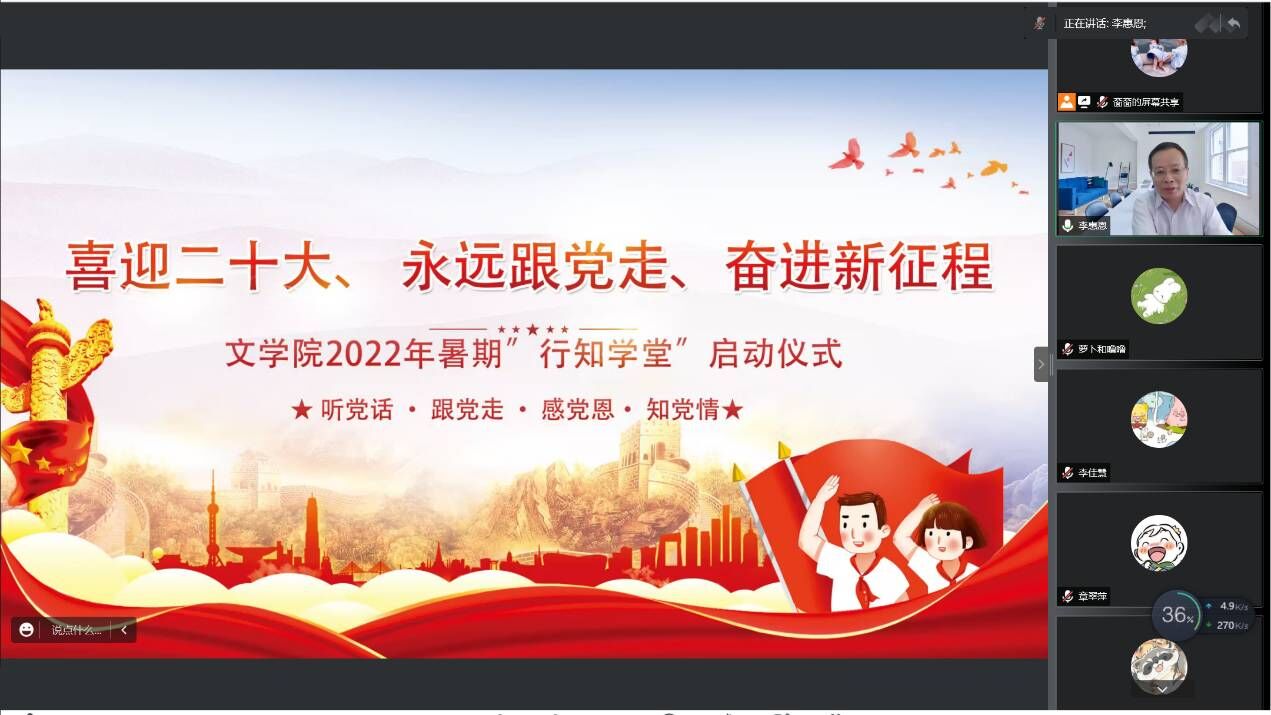 本网讯 6月24日上午,文学院召开了以“喜迎二十大、永远跟党走、奋进新征程”为主题的2022年暑假“行知学堂”实践活动线上启动仪式。文学院党委书记李旺生、分团委负责人李惠恩、疏淑进以及全体小先生出席了启动仪式。启动仪式由李惠恩主持。