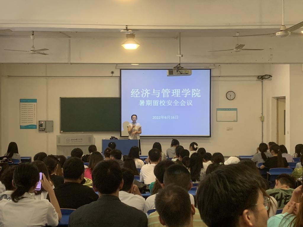 本网讯 为切实做好2022年暑期留校学生的安全教育工作,明确学生在暑期留校期间的安全责任与义务,提高留校学生的安全防范意识,6月16日上午10点半,经济与管理学院在锦绣校区逸夫楼A109教室,面向暑期留校的160名学生,开展了暑期留校学生安全管理会议。学院党委副书记陶敏,辅导员陈梦莹、王瑞瑞出席本次会议。