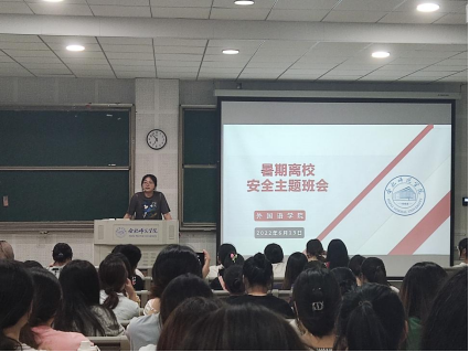 本网讯 为进一步增强学生安全意识和防范能力,切实做好学生暑期安全教育工作。6月13日晚,外国语学院在滨湖校区博学楼D101召开暑期安全教育主题班会,学院共有460余名学生参加此次班会,本次班会由辅导员冯晓敏主持。