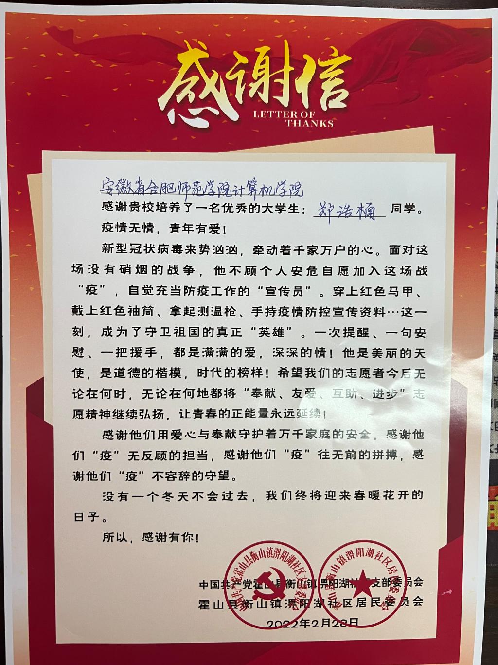 本网讯 近日,计算机学院收到六安市霍山县衡山镇淠阳湖社区发来的感谢信,高度赞扬我院2019级数据科学与大数据技术专业郑浩楠同学在寒假期间为淠阳湖社区疫情防控工作做出的积极贡献。