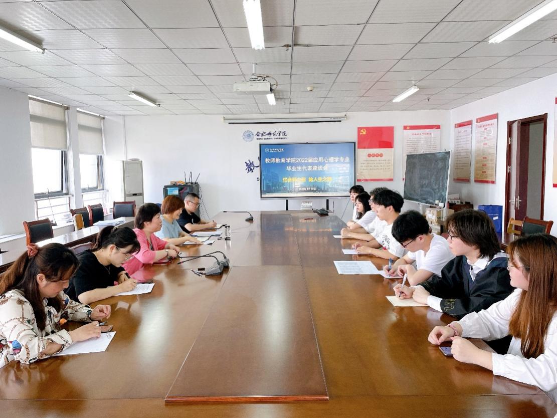 本网讯 5月25日上午,教师教育学院在行知楼710会议室举行2022届应用心理学专业毕业生代表座谈会。教师教育学院院长李群、心理系主任吴桂翎、教师代表晋玉、胡哲和吴姗姗出席座谈会,2022届应用心理学专业梁天翔、杨金艳、王瑞等8位毕业生代表参加了座谈会。座谈会由吴桂翎主持。