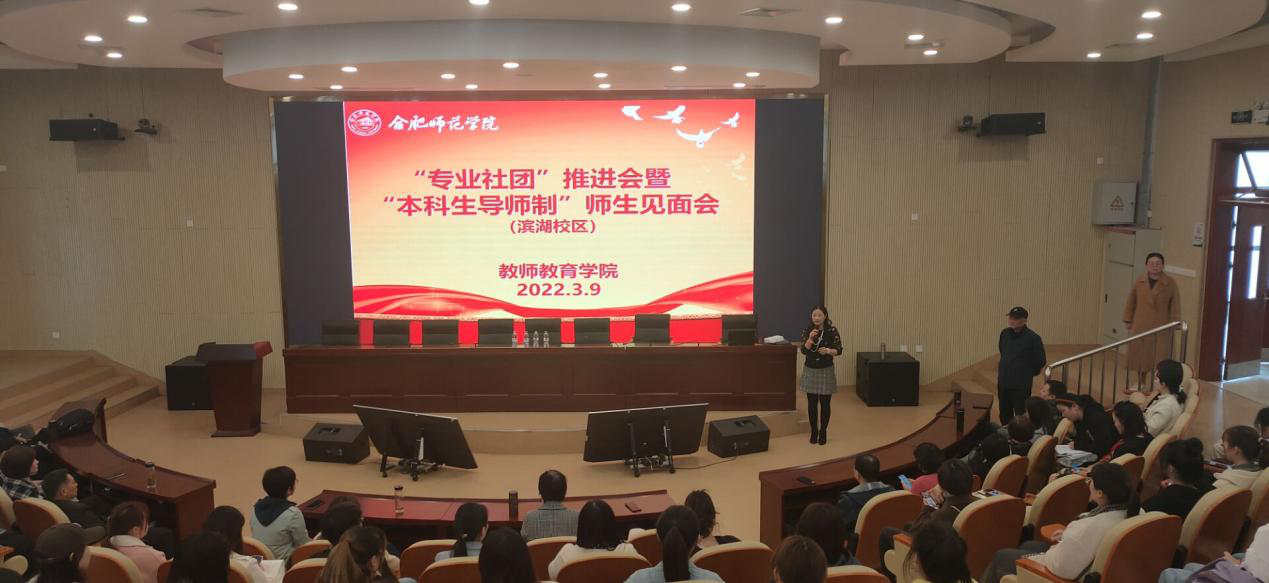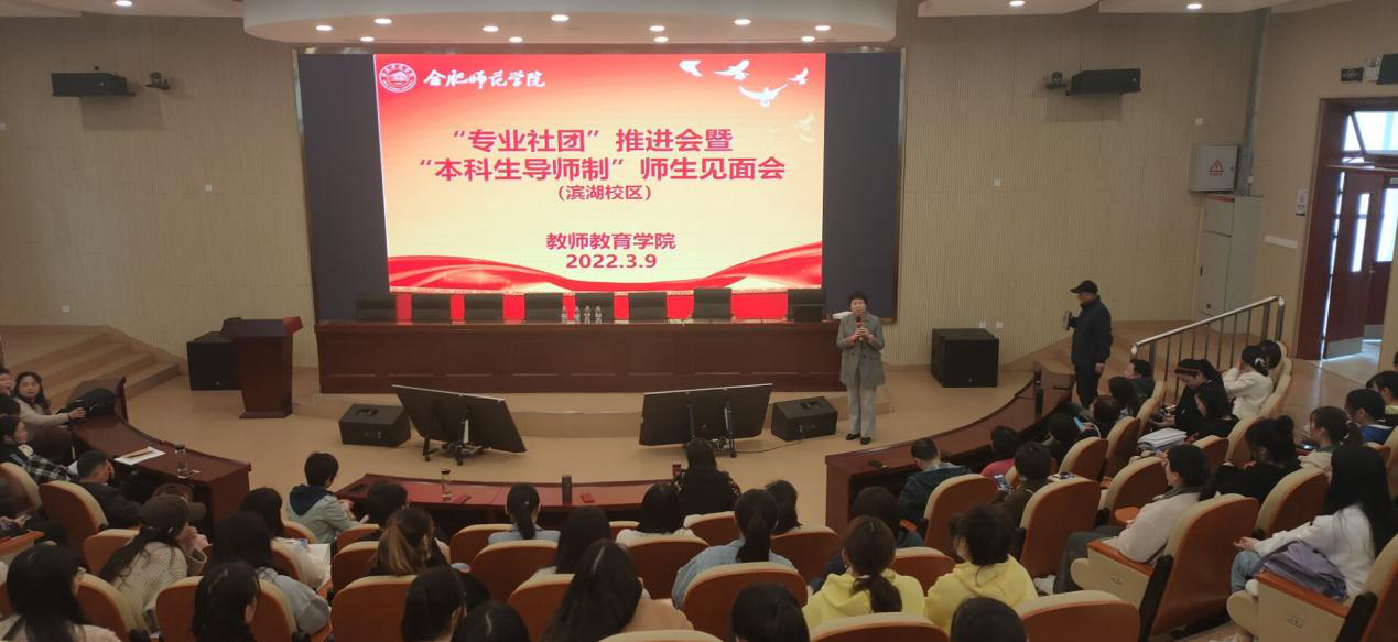 本网讯 为了推进学院学生“导师制”工作,促进教师与学生之间的沟通交流,提升学生专业技能,3月9日下午,教师教育学院在滨湖校区学术报告厅举办教师教育学院“专业社团”推进会暨“本科生导师制”师生见面会。学院党委书记穆娟、院长李群、全体教师和2021级全体同学参加本次会议,副院长闫龙主持。