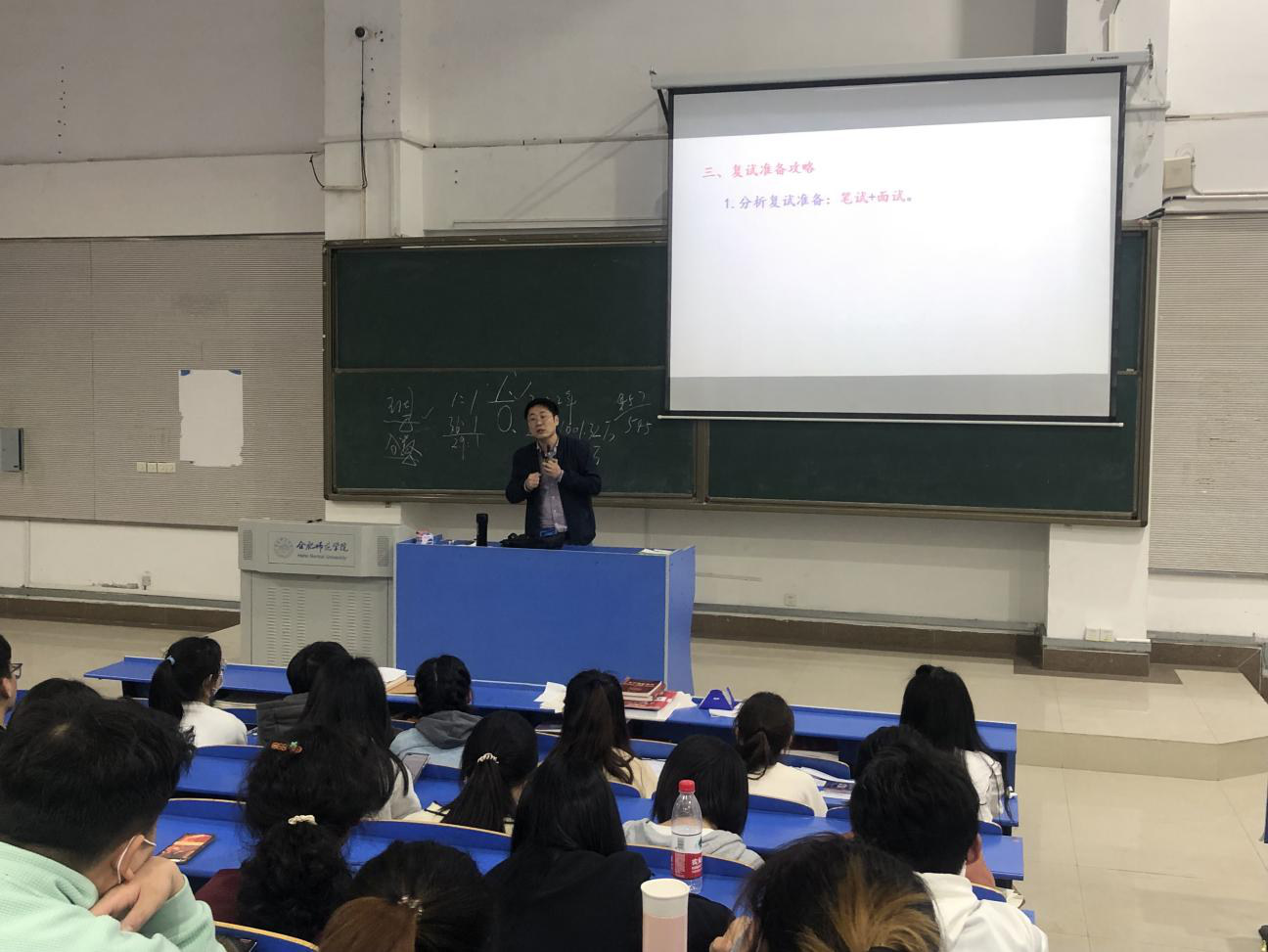 王占军老师具有多年招录硕士研究生的工作经验,他结合近5年研究生报录比以及报考研究生人数不断增长的趋势对2022年考研形势进行了分析;讲述了往届学生考研情况,用具体事例告诉考生如何依据自身实际情况选择调剂还是二战;重点详细介绍了考研复试技巧,从面试和笔试两方面剖析备考注意事项,提醒同学们在面试前积极丰富自己的个人简历和科研经历,锻炼外语能力,面试过程中保持自信自强,充分展示自己在大学学习和实践中的亮点成果。最后王老师用自己最喜欢的电视剧《亮剑》的剧照,鼓励考生在这个阶段亮出自己的闪光点。