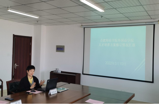 马四民书记代表学院对到访的黄山学院外国语学院表示欢迎,在双方简单介绍各自学院的专业设置基本概况和办学特色会之后,学院英语系副主任钱莉娜从指导思想与原则、前期调研、多轮研讨和论证和具体修改情况等四个方面详细汇报英语师范专业人才培养方案修订情况。在随后的交流阶段,双方就外院各专业的培养方案问题暂开了充分地交流,尤其是师范专业的课程开设、“三习”和毕业论文等问题。通过这次交流,双方都感到收获很大,进一步加强两院之间沟通交流,在工作中互相学习,互补共进,合作共赢。