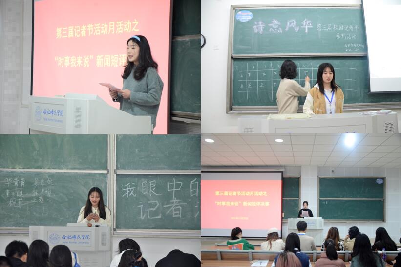 本次记者节月系列活动由“时事我来说”短评征集活动、“诗意风华”诗文创作比赛活动、“镜头里的故事”叙事摄影大赛活动、“趣‘抖’合师”短视频征集活动、“文创新媒体”微信编辑技能竞赛活动、“我眼中的学生记者”主题演讲比赛以及记者节晚会暨活动月闭幕式七个子活动组成。