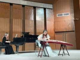如:古筝协奏《海之波澜》、重奏《盛世国乐》,琵琶独奏《霸王卸甲》、重奏《阳春白雪》,竹笛独奏《苍》、齐奏《游击队歌》,二胡独奏《蒙风》,长笛、黑管、钢琴《莫扎特三重奏》,木管重奏《肖斯塔科维奇第二圆舞曲》,弦乐四重奏《茉莉花》等,体现了本场艺术实践的特色。在汇报音乐会上,器乐系教师到场观看。