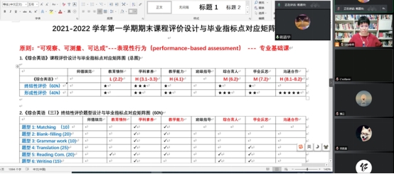 此次线上培训会议既是英语师范认证研讨,也是信息化教学智慧师资培训,进一步强化了英语师范专业全体任课教师对英语师范专业毕业要求指标点的理解,明确了制卷工作对标、对表、对准毕业要求指标点的实施要领,为后期制卷等一系列工作的有序落实夯实了基础;通过线上互动答题实操,使参会教师对以学生为中心的智慧教学设计有了更加深刻的认知并掌握了方法。(外国语学院:强云 钱莉娜)