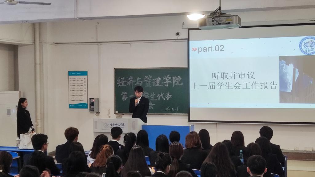 白翠龙同学代表经济与管理学院第十六届团委组织,作了题为《坚定理想信念 砥砺奋进前行 服务青年成长 谱写青春华章》的工作报告。总结回顾了过去一年间学院学生会取得的成绩和特色成果,并对下一阶段学生会在政治引领、学风建设、服务同学等方面工作进行展望。