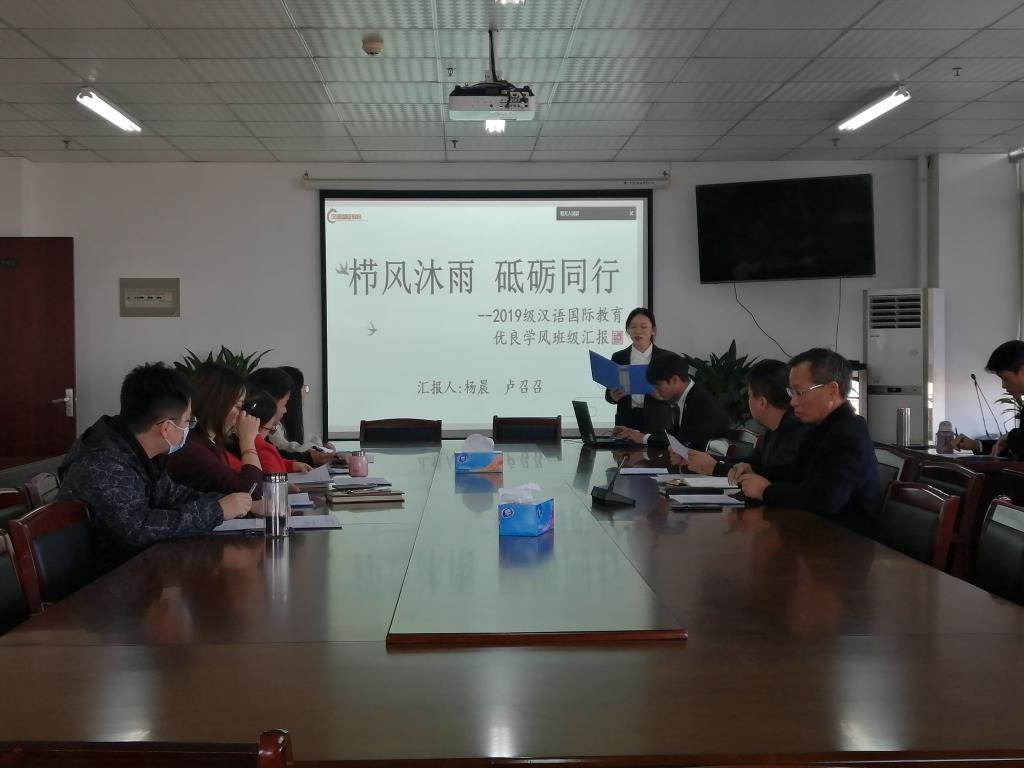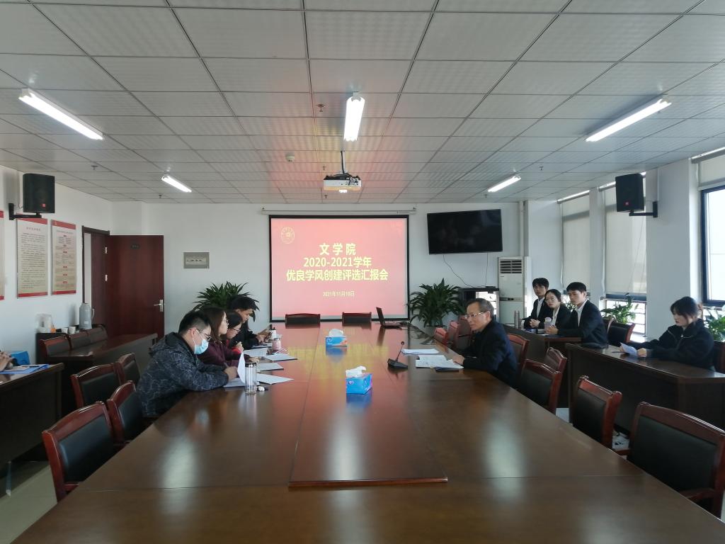 本网讯 为进一步加强我院的学风、班风建设,全面激发学生自觉学习、奋发进取、立志成才的积极性,不断增强学生成长成才的动力,提高人才培养质量。文学院于11月10日在锦绣校区行知楼802会议室成功举办2020-2021学年优良学风创建评选汇报会,出席本次会议的有文学院党委书记李旺生、党委副书记陈好、各年级辅导员以及各班级学生代表。