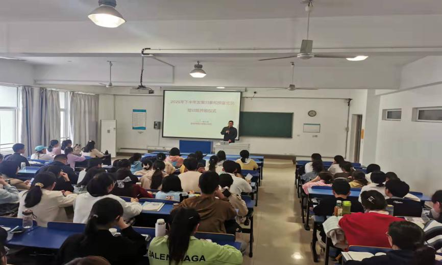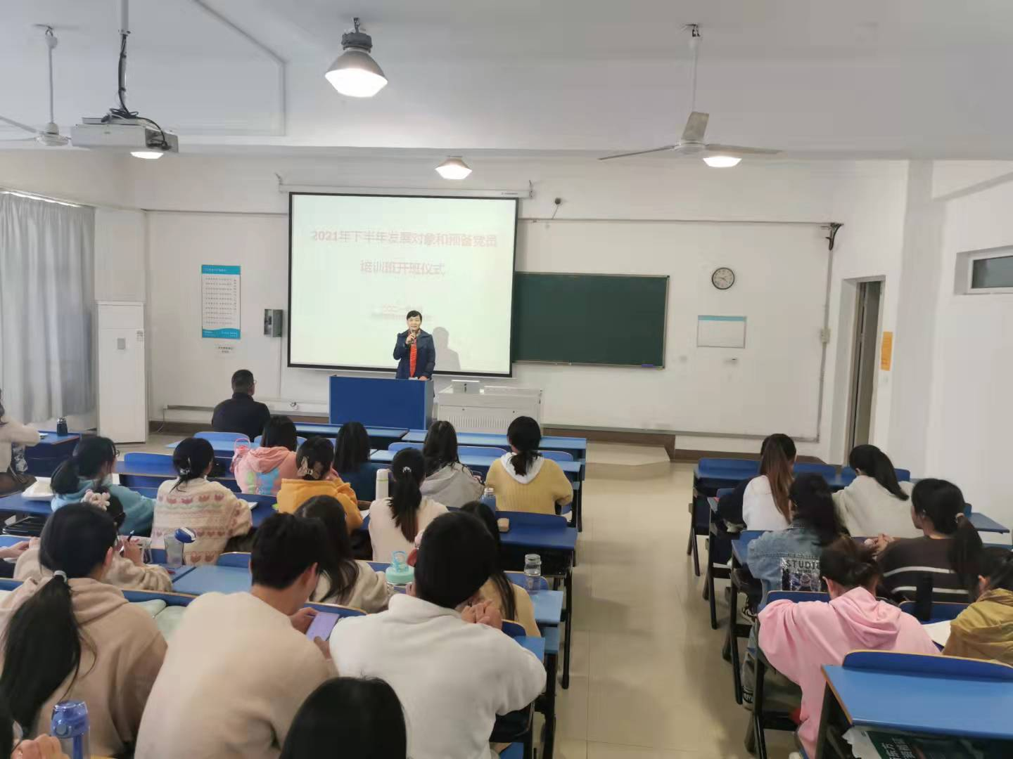 本网讯 10月26日,数学与统计学院分党校2021年下半年发展对象与预备党员培训班在锦绣校区逸夫楼A406举行,数学与统计学院党委书记郑支农、党委副书记陶金昌,88名发展对象和预备党员参加了开班仪式,仪式由学生党支部书记杨尔飞主持。
