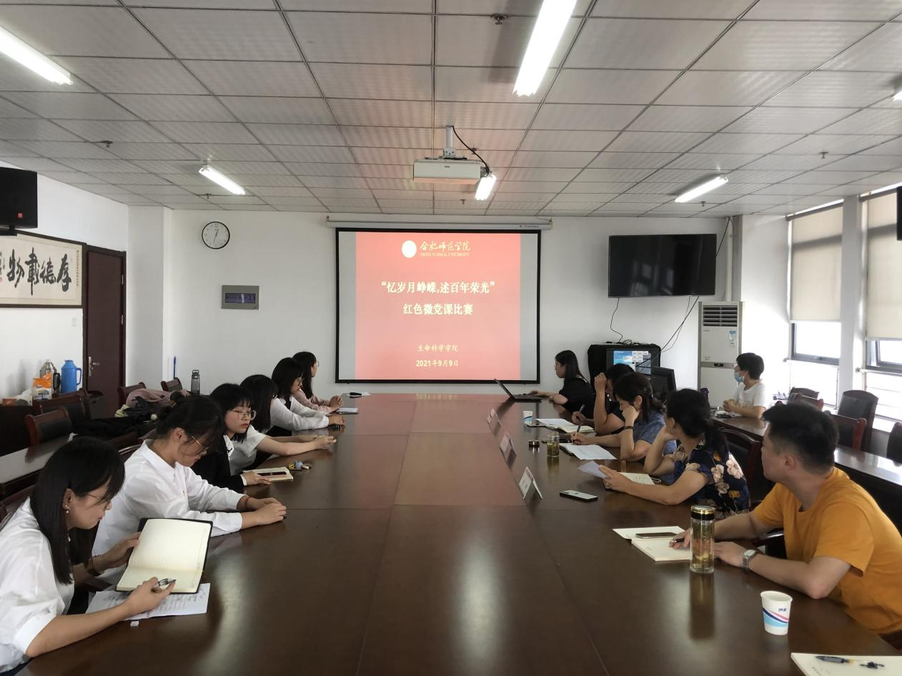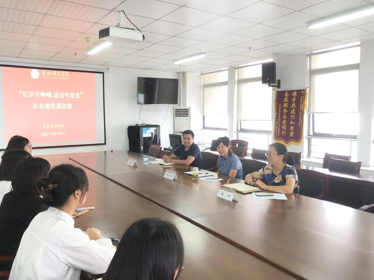 本网讯 为深入推进党史学习教育,全面落实《生命科学学院关于“十个一”红色党史学习教育方案》,教育引导师生党员深入了解党的光辉历史、感悟党的初心使命、领会党的创新理论、传承党的红色基因,9月9日中午,生命科学学院党委在行知楼1502举行“忆岁月峥嵘,述百年荣光”红色微党课比赛。本次比赛面向全体师生党员,师生党员同上一堂微党课。比赛由学院党委书记郭桃芬、副书记杨娜、校党委组织部组织科科长吴世红担任评委,由党政秘书黄文婷主持。