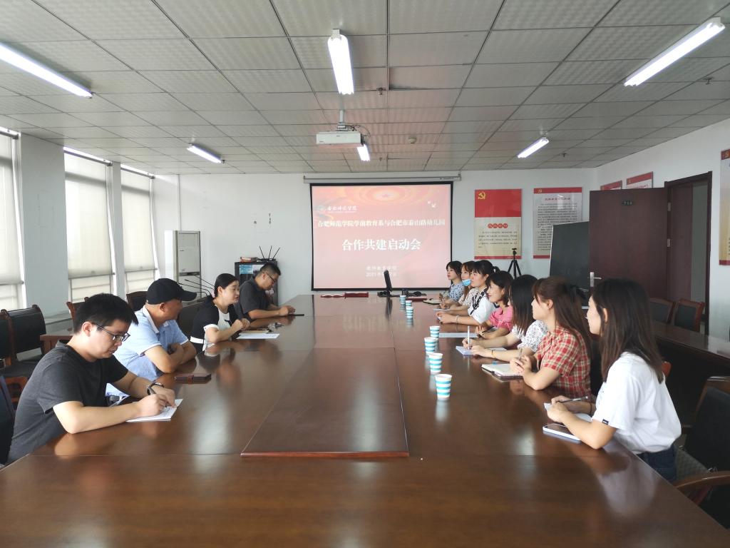 本网讯 9月7日上午,beat365唯一官方网站教师教育学院学前教育系与合肥市泰山路幼儿园合作共建启动会在行知楼710举行。教师教育学院党委书记穆娟、副院长闫龙、学前系学科带头人胡连峰、学前系教师李辉,合肥市泰山路幼儿园园长华琳琳,教学主任徐晓,后勤主任秦蓉和骨干教师等参加启动会。