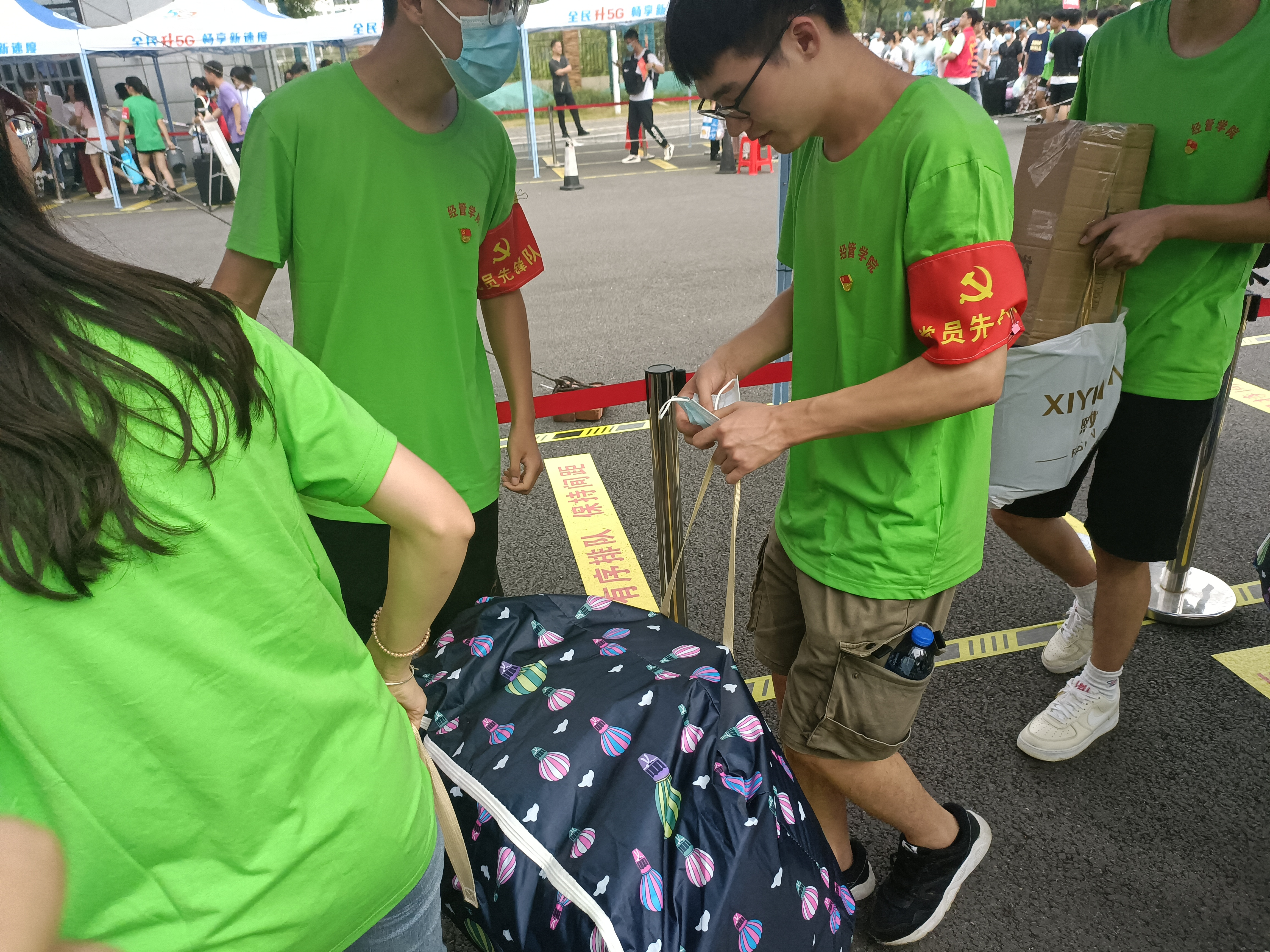 早上7时许,学院所有参与志愿服务的学生党员统一着装,佩戴党员徽章,亮明党员身份,乘坐大巴前往滨湖校区。他们分工明确,相互配合。党员作为志愿者,主要的工作是对报到新生进行引导,做好接待、引路、咨询、协助新生搬运行李等一系列工作。每位党员志愿者坚守岗位,让新生们切实感受到了经管学院大家庭的温暖。醒目的绿背心成为迎新现场一道流动着的靓丽风景线。