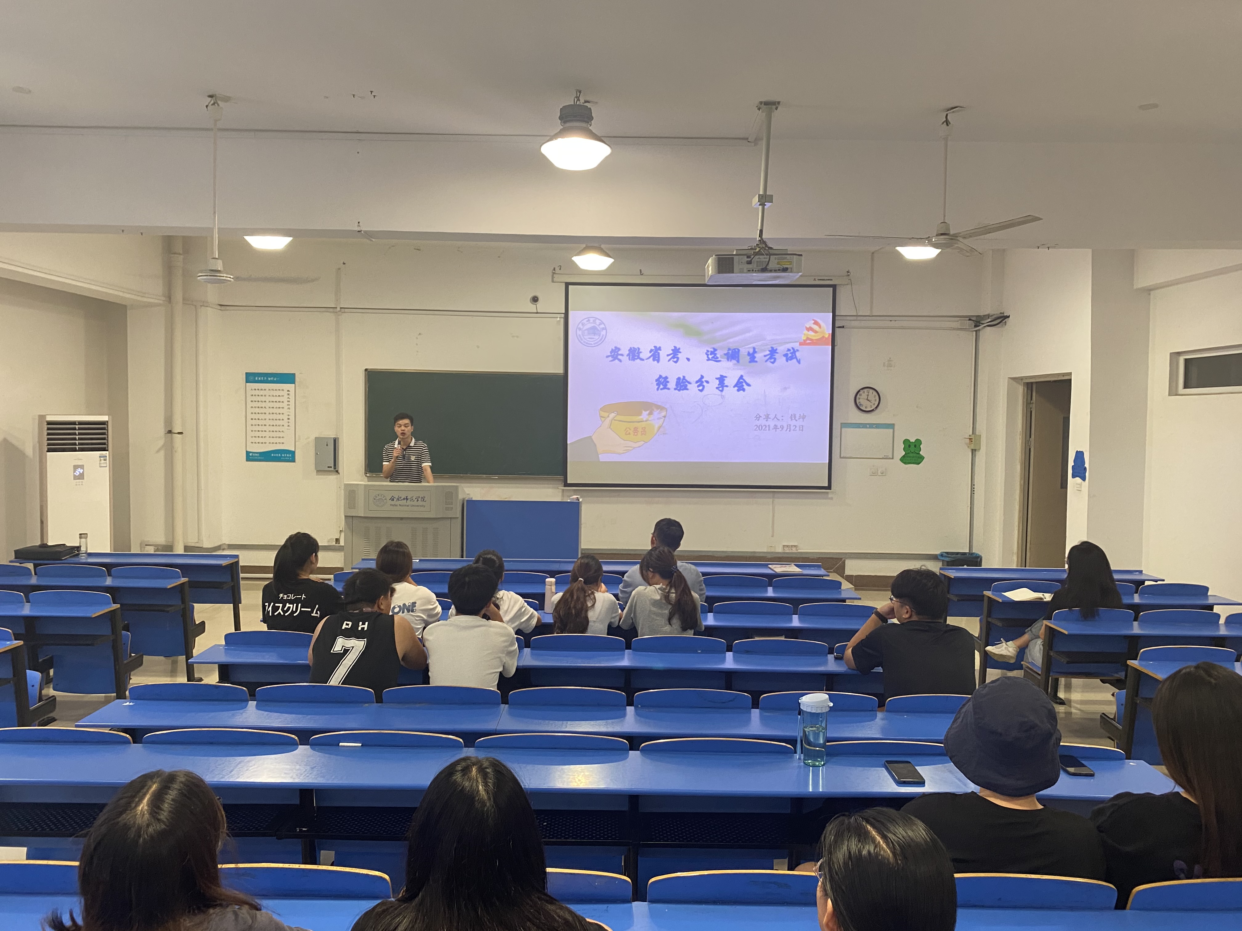 钱坤参加2021年安徽省选调生考试,并以优异的成绩被录取。在交流会上,钱坤从“心有理想向往基层、不忘初心牢记使命、自信昂扬面试不慌、知己知彼百战不殆”等几个方面,分享了自己选调生考试中笔试和面试两个环节过程中的经验和做法,同时,对公务员及选调生的报考条件、职业发展等作了详细的介绍。在最后的交流环节,同学们积极提出自己的疑问,钱坤逐一耐心解答,并鼓励大家明确目标,不懈努力,扎实备考。