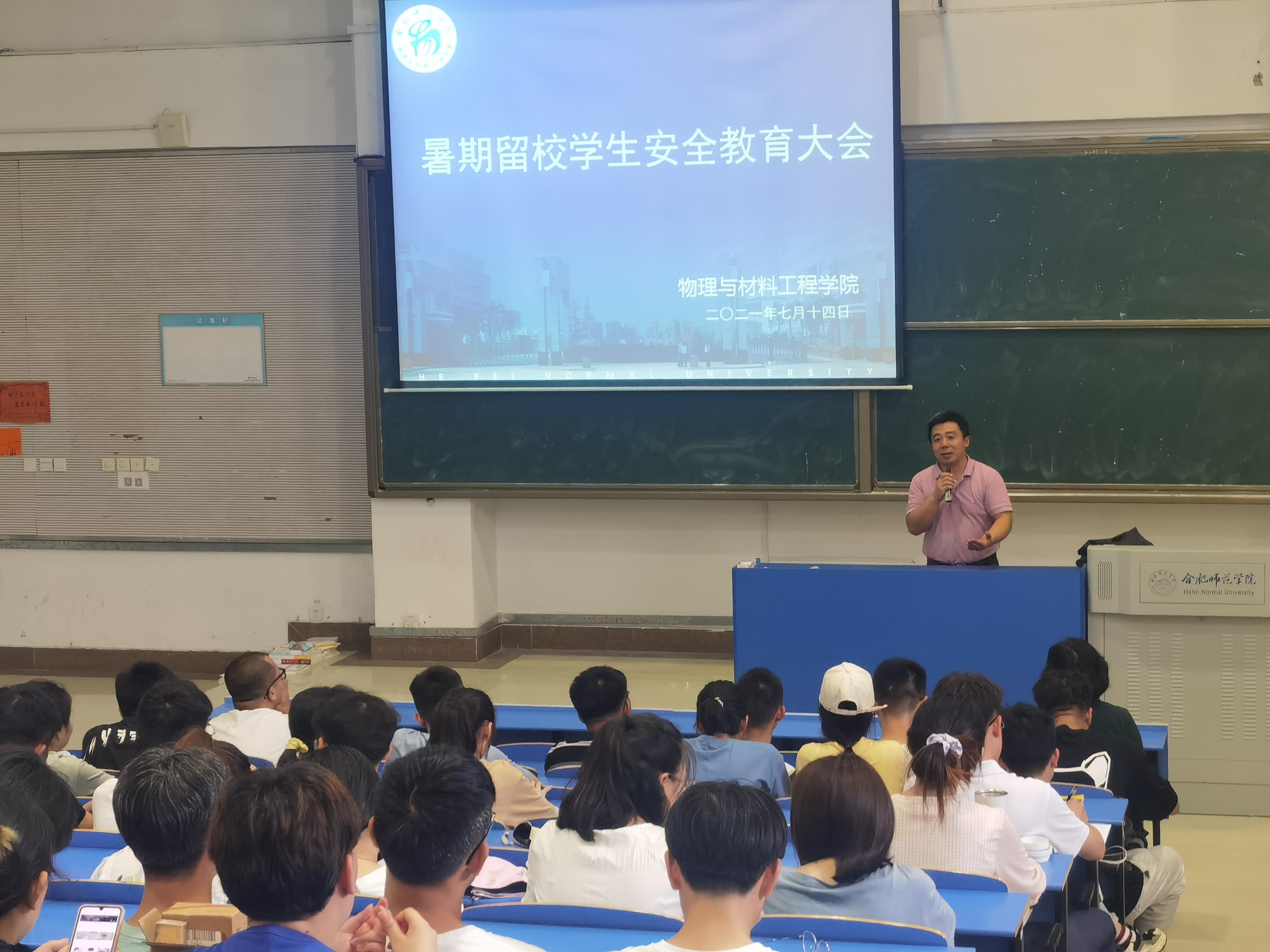 本网讯 为落实学校关于加强暑期留校学生安全工作的要求,物理与材料工程学院于7月14日下午在逸夫楼西阶2教室召开暑假留校学生安全教育大会。会议由辅导员吴梦云主持,学院党委书记唐洁、党委副书记吴震、辅导员赵厚德及全体留校学生参加会议。
