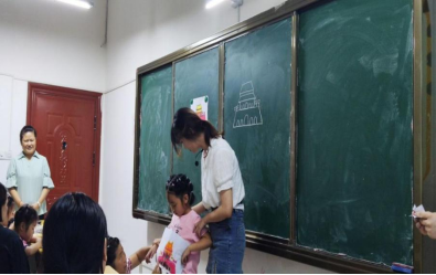 在美术课上,“小先生”齐美凤在黑板上演示北京天安门简笔画的创作过程,小学员们在绘画时则会加入自己的想法和创意,绘画完成后纷纷上台展示自己的作品,并获得“小先生”们的认真点评和奖品鼓励。
