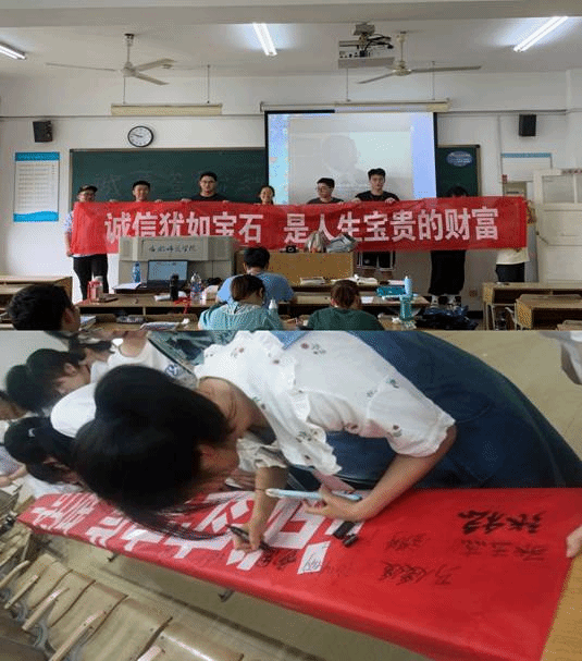 强化诚信意识,做到“以诚实守信为荣”。全体同学进行诚信宣誓:“新时代大学生应恪守‘诚信为本’,发奋学习、积极进取,让诚实守信成为和谐校园的永恒主题。”从我做起,从身边做起,自强不息、诚信做人,共同塑造大学生的诚信形象。