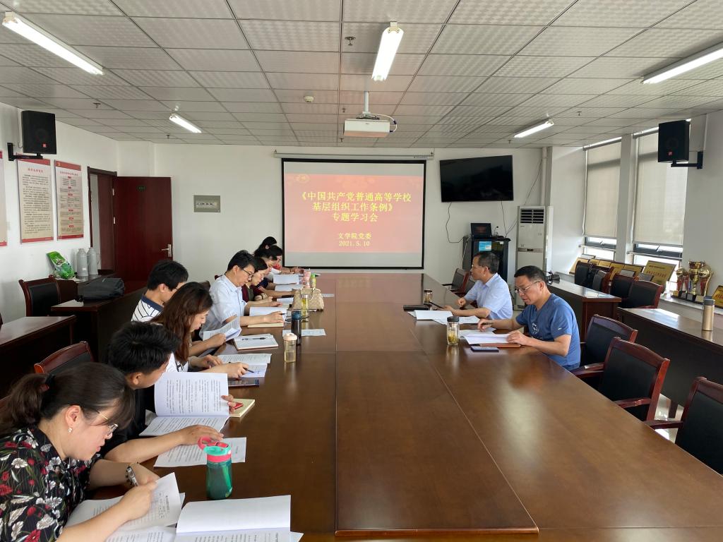 本网讯 5月10日上午,文学院在行知楼学院会议室组织专题学习《中国共产党普通高等学校基层组织工作条例》,文学院党政领导班子、党委委员、党支部书记、党支部委员参加本次学习。专题学习会由文学院党委书记李旺生主持。