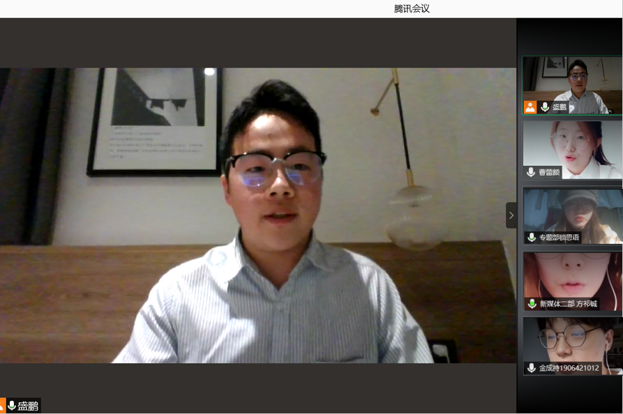 本网讯 12月30日和1月3日,校团委学生组织合师青年传媒中心(以下简称“合师青年”)分别通过“线上+线下”的形式,于腾讯会议和锦绣校区行知楼416会议室召开2020—2021学年第一学期述职大会暨总结表彰会议。第十六届合师青年传媒中心全体学生干部参加会议,“合师青年”指导教师、校团委宣传思想部负责人王露出席会议。“合师青年”办公室副主任周港花主持会议。