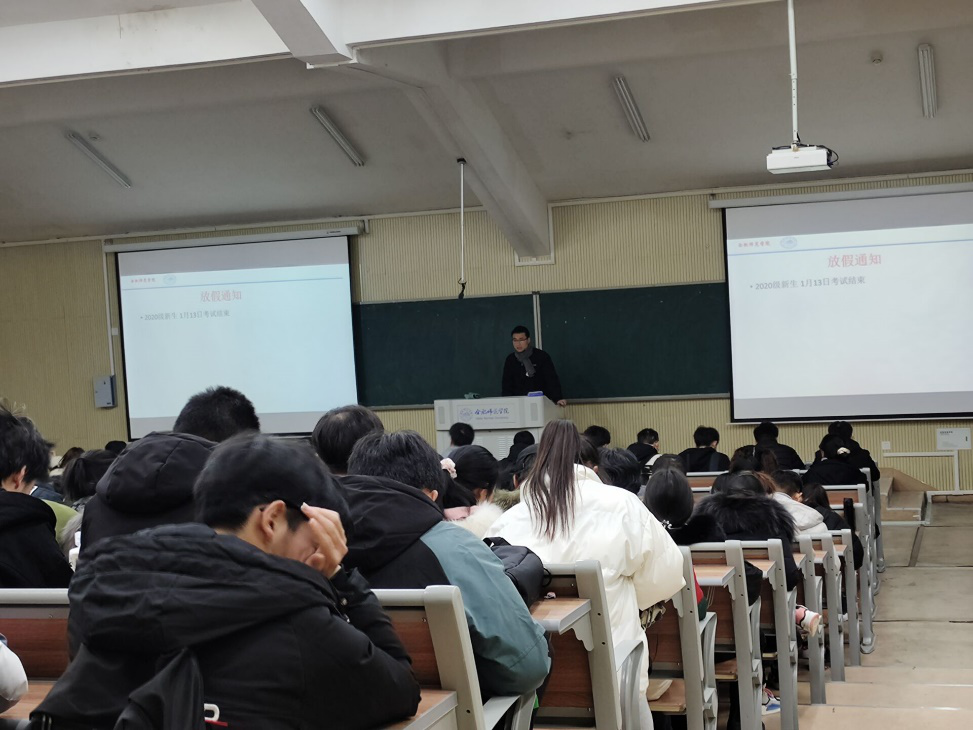 本网讯 期末考试在即,为营造公平、公正、有序和谐的竞争平台,创建优良班风、考风、学风。12月21日,物理与材料工程学院在滨湖校区铭传楼A101召开以“文明考风,诚信考试”为主题的教育班会。班会由辅导员赵厚德主持,2020级全体新生参加。