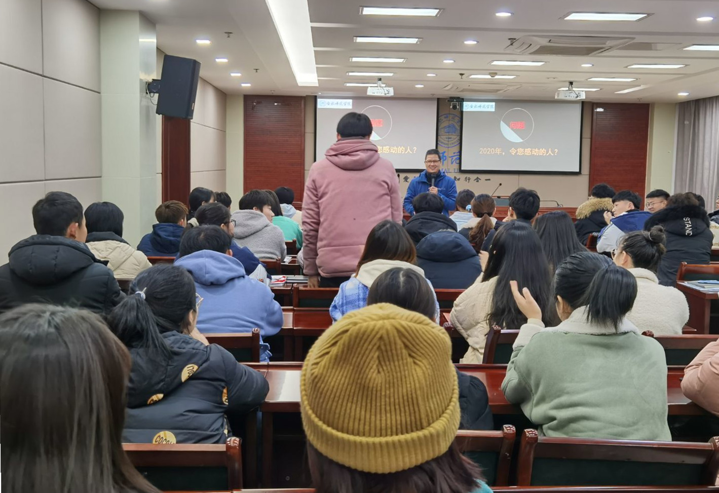 讲座伊始,何光辉以“何谓担当”的问题发问,引导同学们思考“2020年最令我感动的人”“2020年给我留下深刻印象的‘流行语’”这样两个问题,并与同学们展开了交流。