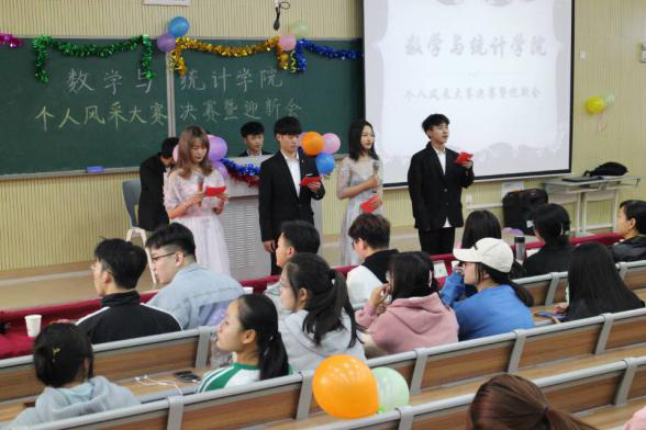 本网讯 为加强学生间的互动交流,促进学生全面发展,数学与统计学院于11月14日在铭传楼A101成功举办第四届个人风采大赛决赛。此次比赛的评委由数学与统计学院党委书记郑支农、分团委书记刘全亚、2020级辅导员王志、外国语学院冯晓敏、艺术传媒学院邰文强以及数学与统计学院学生会执行主席王子杰、冯子迈、汪锦洋,素质拓展中心主任张骞等人共同担任,此次比赛的主持人是赵宇囡,秦光宗,于小虎,王秋迎。