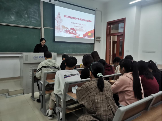本网讯 为深入学习贯彻党的十九届五中全会精神,推动理论学习入脑入心,11月13日晚,外国语学院学生第二党支部在铭传楼A305教室召开理论学习会,组织支部入党积极分子学习党的十九届五中全会精神。