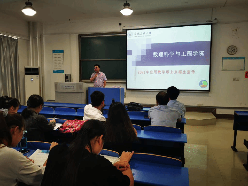 首先,安徽工业大学数理科学与工程学院系主任杨刘分别从安徽工业大学及数理科学与工程学院概况、应用数学硕士点概况、学科和研究方向、培养条件与成果等方面进行了详细讲解,重点介绍了学院在师资队伍、研究方向、人才培养等方面的优势,鼓励我校学子积极报考,实现人生理想。